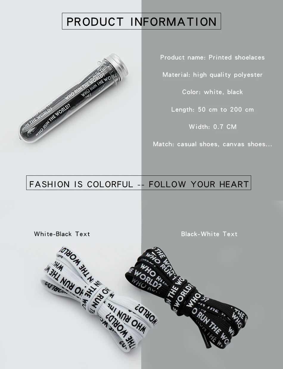 Материал: полиэстер + пластик Функция/сочетание/Применение: шнурки для обуви, шнурки для талии, веревки для шляпы и т. д. Цветовая/разноцветная комбинация: сплошной цвет с надписью «WHO RUN THE WORLD», черный/белый. Спецификация: 60-180 см * 7 мм Диаметр/Ширина: 0,7 см Тип формы: плоский Головка шнурков: прозрачный пластик Вес брутто: 40 г Сертификат: Oeko-tex-100,ISO9001,SGS,CE Посылка: 1 пара/opp полиэтиленовый пакет Индивидуальные: цветовое сочетание/длина и ширина/печать логотипа, пожалуйста, свяжитесь с нашей службой поддержки клиентов