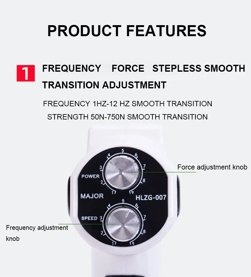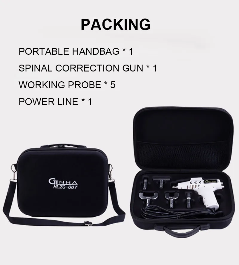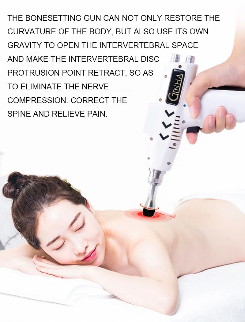 Принцип физического пульса, имитирующий массаж рук, установка одной кости! Пистолет для коррекции позвоночника основан на силе, генерируемой физическим пульсом. Эффект неэлектронной импульсной силы очень сильное проникновение. Этот вид силы, генерируемый пульсом физической терапии, в сотни раз сильнее, чем у ручного массажа. Он имеет преимущества быстрой скорости передачи и сильного проникновения.