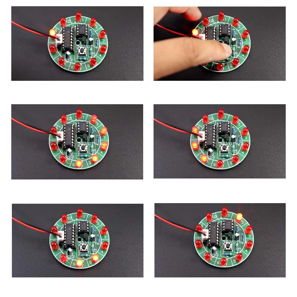 Описание продукта: продукт состоит из 10 шт. 5 мм красный светильник, излучающий диоды. После нажатия на выключатель светодиодный индикатор быстро мигает и произвольно остается через несколько секунд. Один из светодиодов включен, а другие выключены. Это стало счастливым поворотным столом.