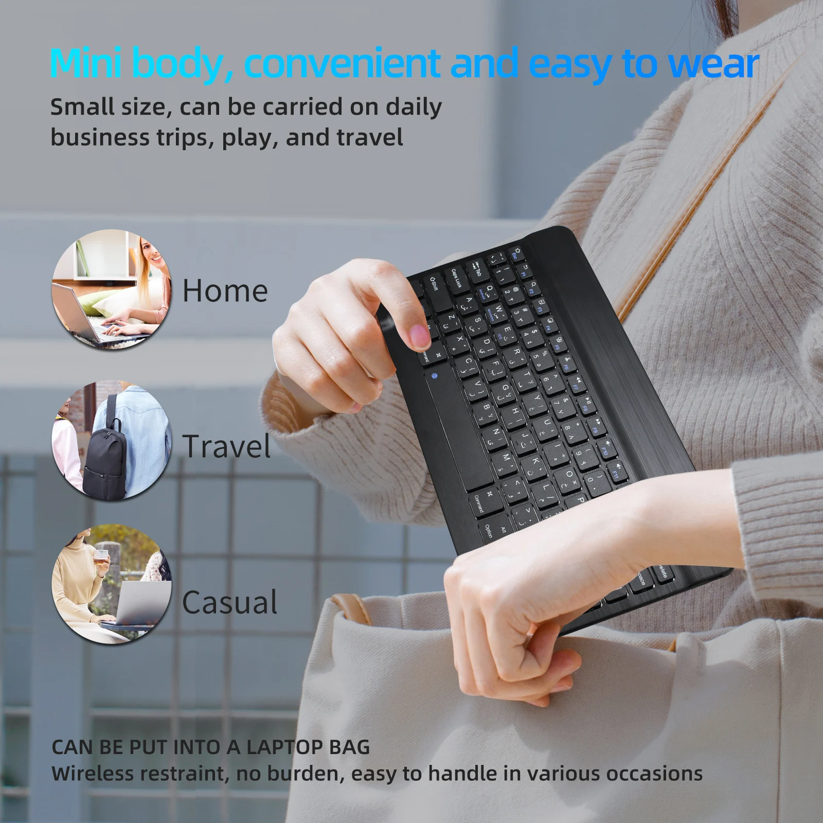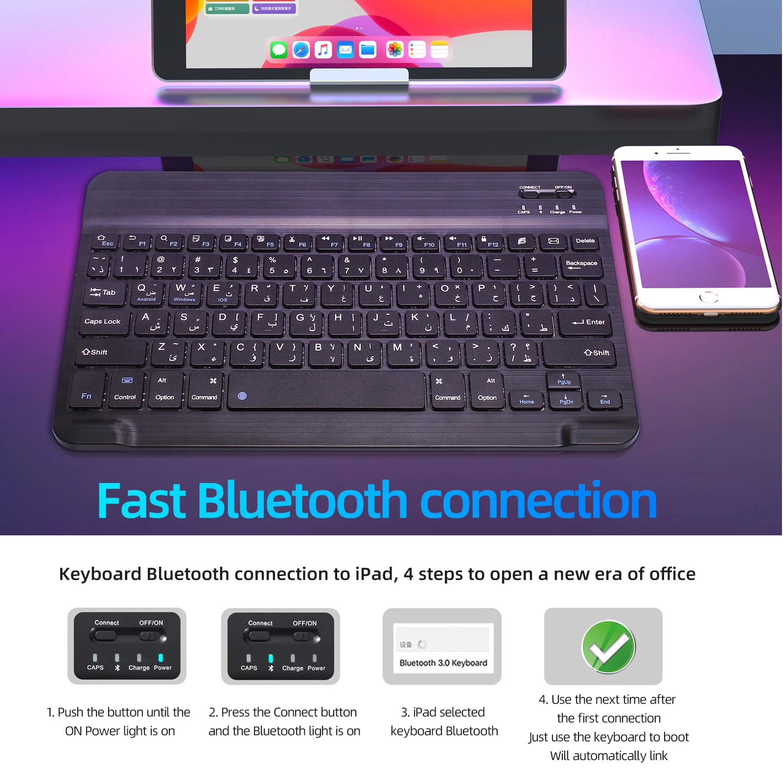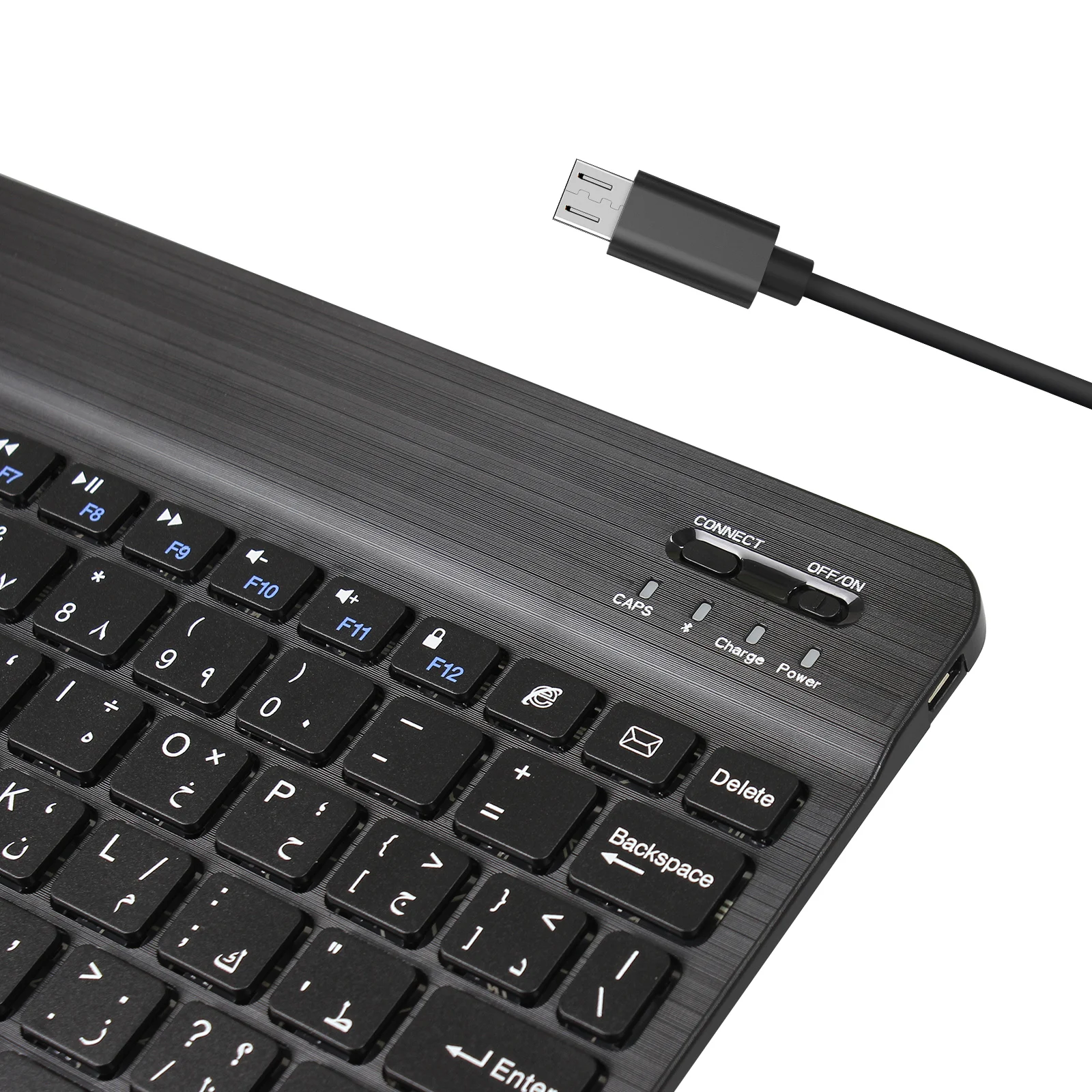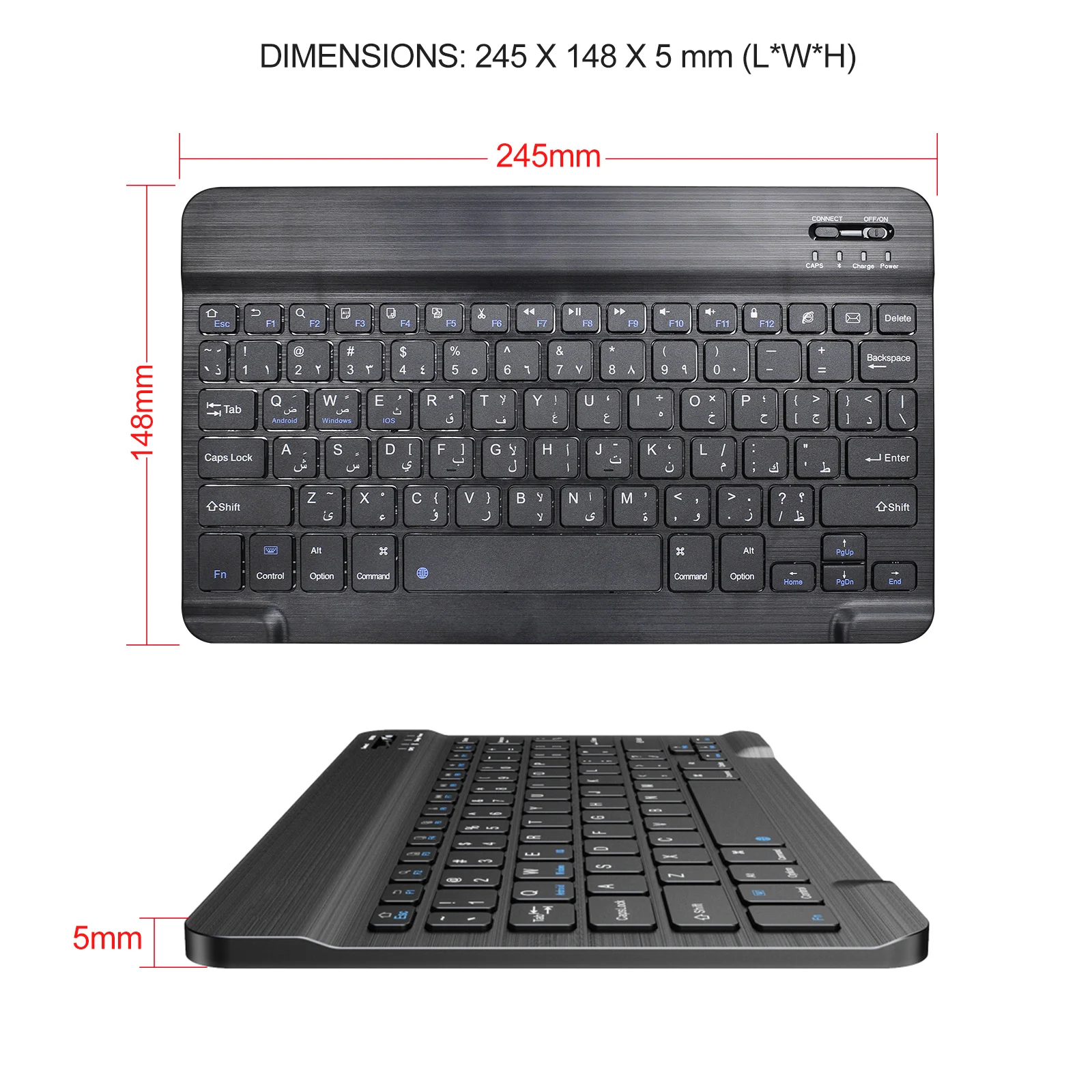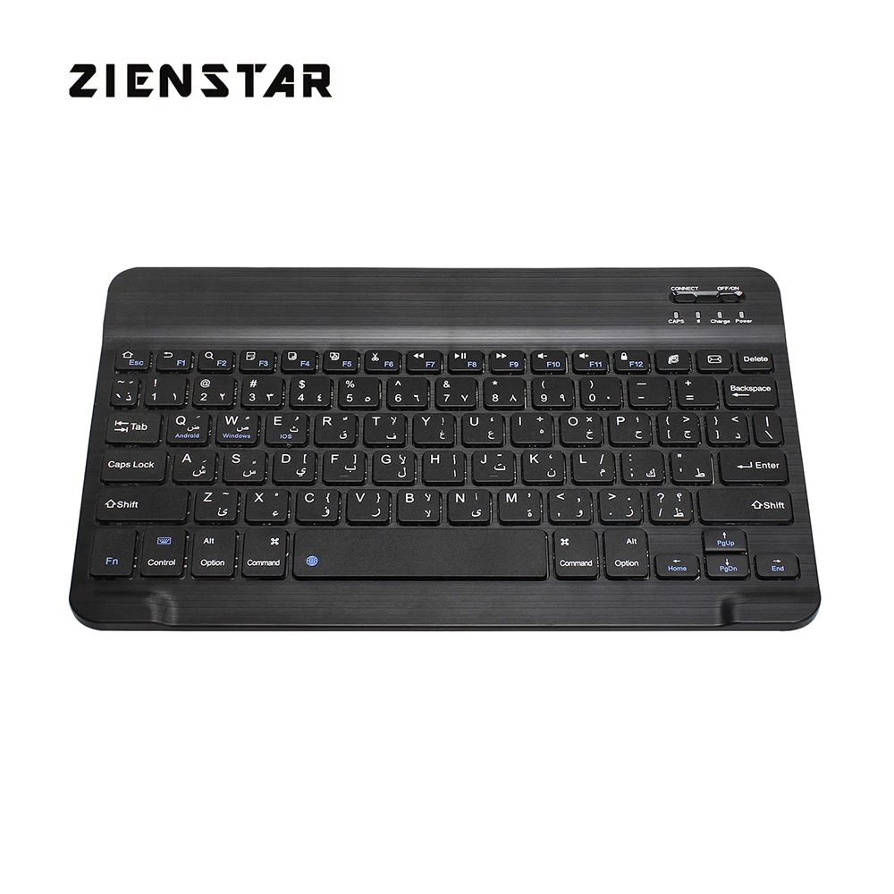 Ультратонкая 10-дюймовая Арабская Беспроводная bluetooth-клавиатура для IPAD,MACBOOK, ноутбука, компьютера и планшета, Samsung Tab, перезаряжаемая батареяОсобенность:100% новый товар высокого качества.Совершенно новый и высококачественный с цельной задней крышкой из алюминиевого сплава.Матовая металлическая Текстурирующая панель клавиатуры не скользит и дает ощущение высокого класса.Портативный, ультратонкий, удобно носить с собой в путешествие или в командировку.Его можно использовать со смартфоном, планшетом, ноутбуком и настольным компьютером.Используйте модуль Broadcom Bluetooth 3,0 со стабильным качеством.Внешний вид разработан специально для Вашего iPad mini. Система предназначена для Windows,Android,IOS. Пожалуйста, нажмите Fn + Android или Fn + Windows или Fn + IOS, чтобы переключить системный режим. (после подключения bluetooth)Светильник вес, тихие нажатия клавиш, водонепроницаемый, пыленепроницаемыйКлавиатура Ножничного типа, быстрый набор текста, приятные ощущения.Микроинтерфейс, легко заряжать.Энергосберегающий спящий режим клавиатурыХарактеристики:Рабочее расстояние: 10 мМодулирующая система: GFSKРабочая система: система Win, Android и IOSРабочее напряжение: 3,0-5,0 вРабочий ток: <2,0 мАТок в режиме ожидания: 0,3-0,5 мАТок сна: < 25 мкАЗарядный ток: 100 мАВремя зарядки: 4 часаЕмкость литиевого аккумулятора: 300 мАНепрерывное время работы: 40 часовВремя ожидания: 60 днейСрок службы литиевой батареи: 3 годаПрочность ключа: 80 ± 10 гСрок службы ключа: 5 миллионов ударовРабочая температура: -10-+ 55 CРазмеры:245x148x5 мм (Д * Ш * В)Вес: 0,30 кгКоличество ключей: 78 ключейЦвет: черныйСхема: Арабская букваКомплектация:1 Беспроводная мини-клавиатура Bluetooth1 x зарядный кабель Micro USBПожалуйста, обратите внимание, что только когда ваше устройство имеет функцию bluetooth, можно использовать эту клавиатуру.Характеристики: