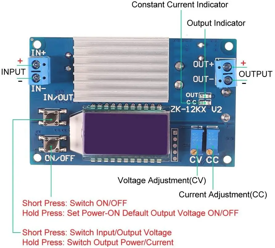 7; Пожалуйста, не делайте коротких выходов по умолчанию из-за 7А. Установите выходное напряжение менее 10 в и поверните потенциометр CC против часовой стрелки более 10 витков, затем короткий выход для регулировки выходного тока