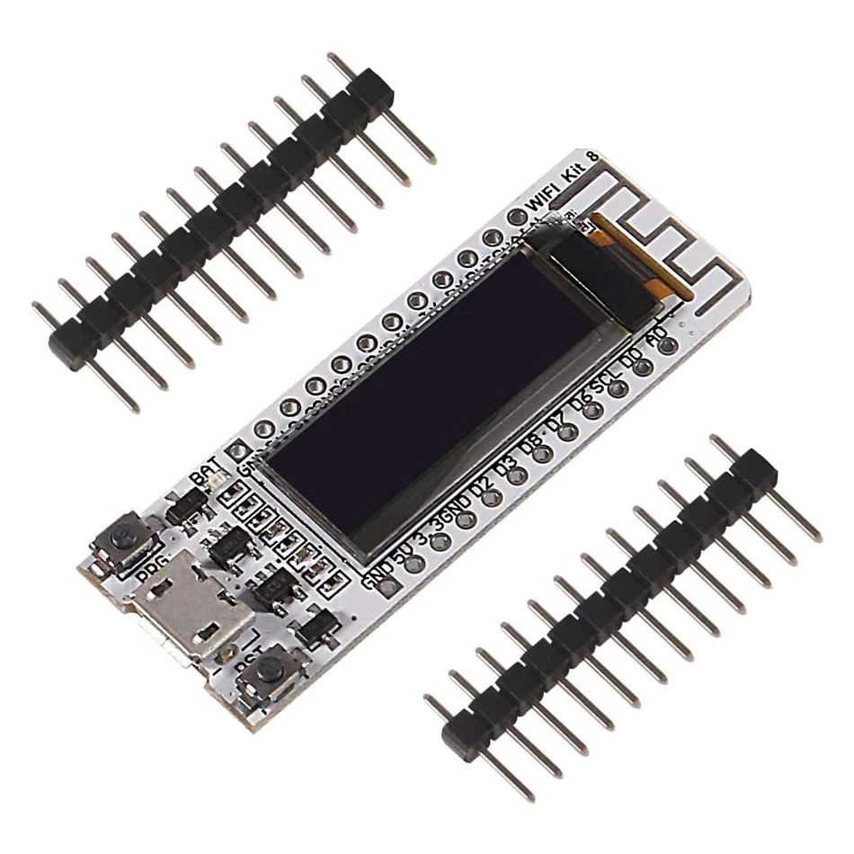 Эта плата ESP8266 OLED с 0,91 дюймовым дисплеем 128*32 OLED, цвет дисплея Белый, с WIFI, вы будете иметь передовую и веселую среду развития! Он имеет 12 цифровых контактов может быть настроен для чтения, записи, межсоединений интегральных схем, SPI, середина, PWM и другие функции; 1 AD вход переменного тока, рабочее напряжение: 3,3 V 7V.