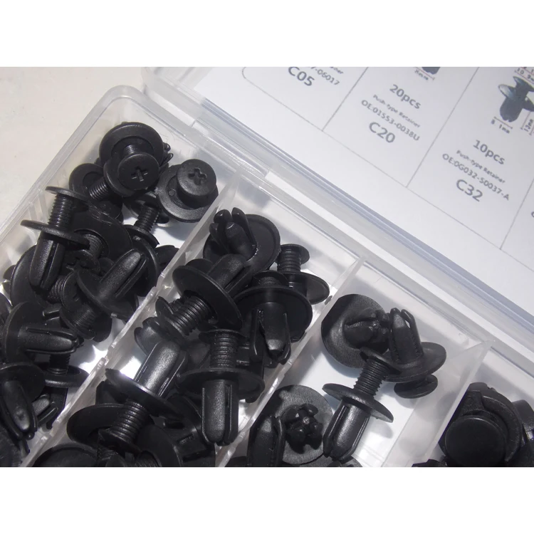 Особенности:-Эти застежки сделаны из нейлонового материала, подходит для использования в автомобиле.-Хороший аксессуар для автомобилей, обычно используется для установки боковых юбок, бамперов и другой отделки.-Набор фиксаторов пуш-типа поставляется с красивой пластиковой коробкой для облегчения выбора типа фиксатора, который вы хотите использовать.-Не нужно беспокоиться о потере или повреждении крепежных деталей. Все необходимые фиксаторы для точной замены старых и сломанных фиксаторов.Характеристики:Материал: нейлонПосылка включает в себя:20 x C05 Заклепки Крепеж20 x C20 Заклепки КрепежЗаклепки 10 x C3210 заклепок B0120 x D02 Заклепки Крепеж20 x A16 Заклепки Крепеж1 х пластиковая коробка