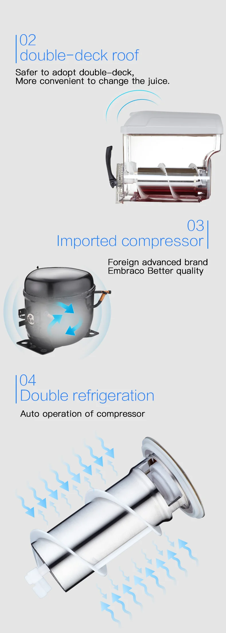 Изготовление смузи, молочных коктейлей, фруктового сока и других напитков, удобное использование, чистая санитария, является идеальным оборудованием для индустрии напитков, чрезвычайно популярным, испаритель из нержавеющей стали, эффект теплопередачи хороший, быстрая подъемная температура. Преимущества маленький размер, светильник вес, низкая потребеление энергии, удобное управление и т. д. Оснащенный струйным насосом, вы можете перемешать впрыску напитков, таких как фонтаны, инновационные и красивые, привлекательные для клиентов. Используя Намагниченный струйный насос, можно намагничать напиток, способствует хорошему здоровью, есть две модели одного охлаждения и горячего и холодного, гуманизированного дизайна, без сезонных изменений беспокойства, пить напрямую, без охлаждения и другого отопления.