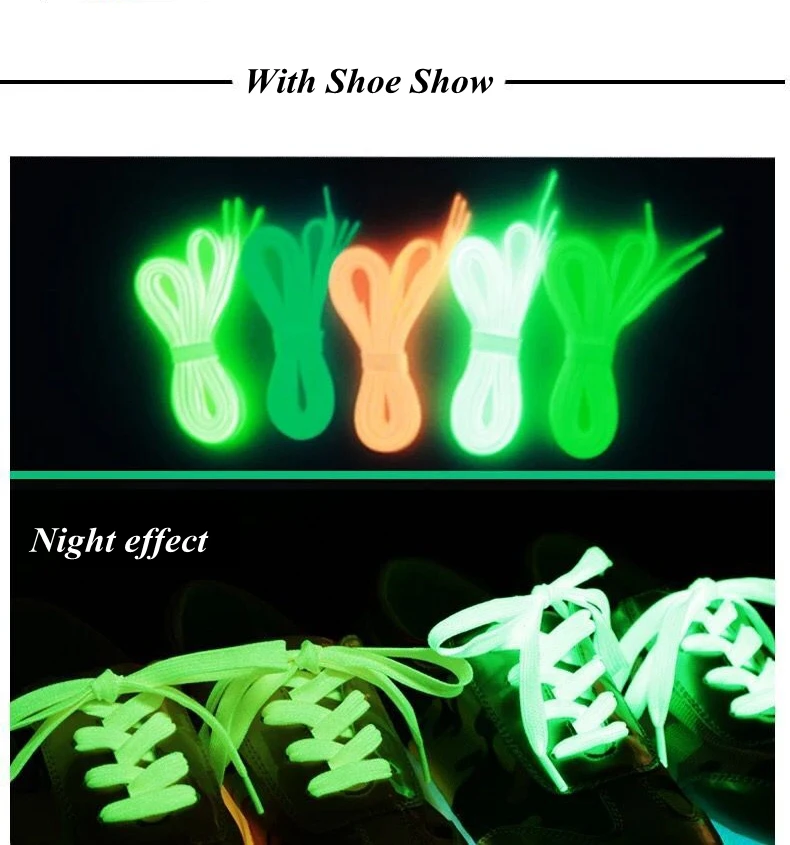 1 пара спортивных светящихся шнурков светится в темноте в ночном цвете флуоресцентные шнурки спортивная обувь на плоской подошве шнурки Лидер продаж Материал: Высокопрочный светящийся материал Размер: 8 мм * 1,2 м Цвет: белый/желтый/зеленый/синий/розовый/небесно-голубой Посылка включает в себя: 1 пара шнурков (2 шт.) Примечание: Яркий Белый флуоресцентный кружевной Синие шнурки относительно темные Такая же яркость, как зеленый и желтый Светящиеся шнурки сияют только в темноте, без питания. Они должны поглощать светильник через солнечный светильник, светильник s, флэш-светильник s или даже движущиеся экраны. После 30 минут поглощения светильник излучает светильник в течение 4-5 часов. Чем сильнее светильник, тем лучше. Они могут светиться снова и снова!