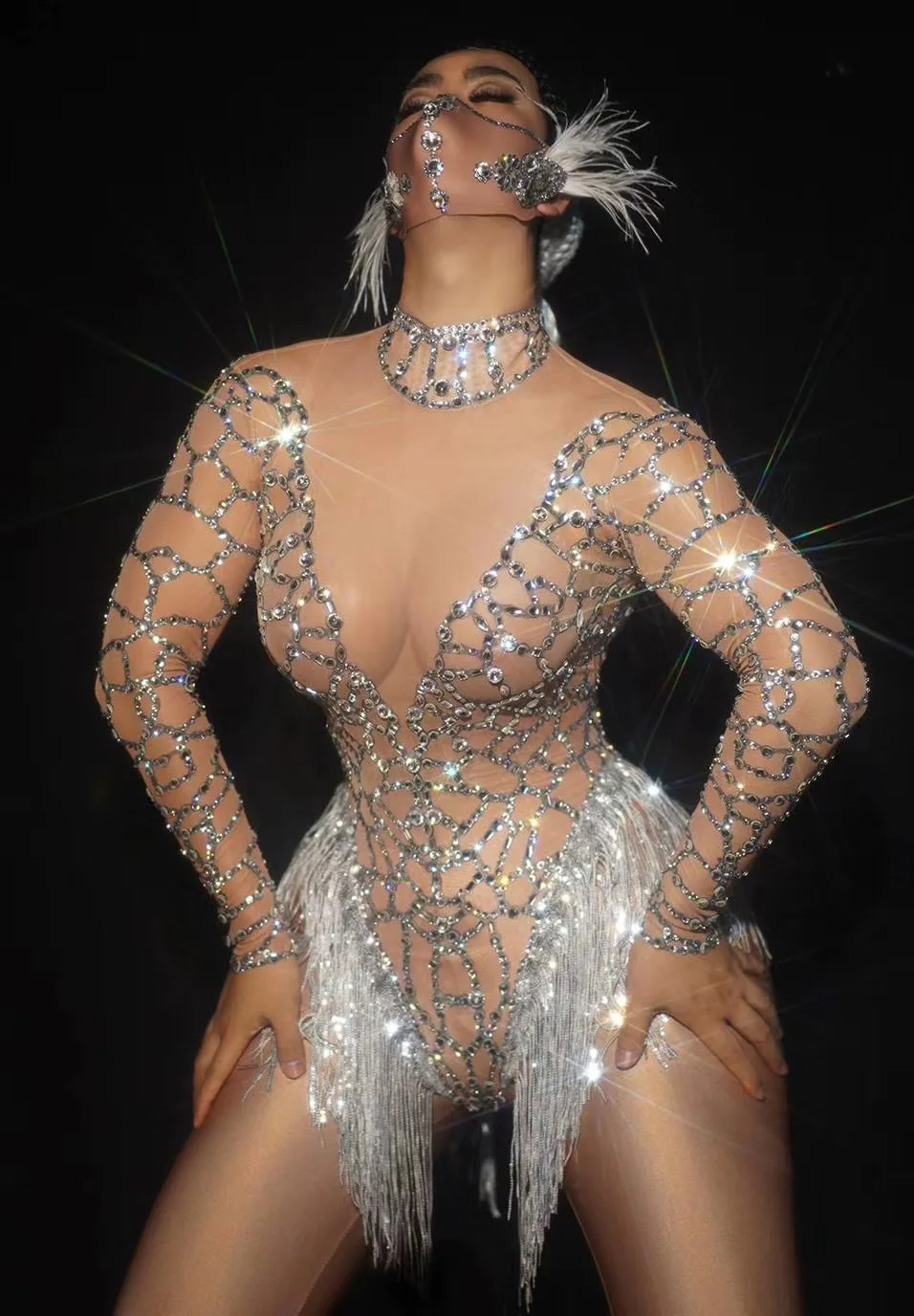 Модный Блестящий женский боди со стразами Серебряный Кристалл бахрома - купить
