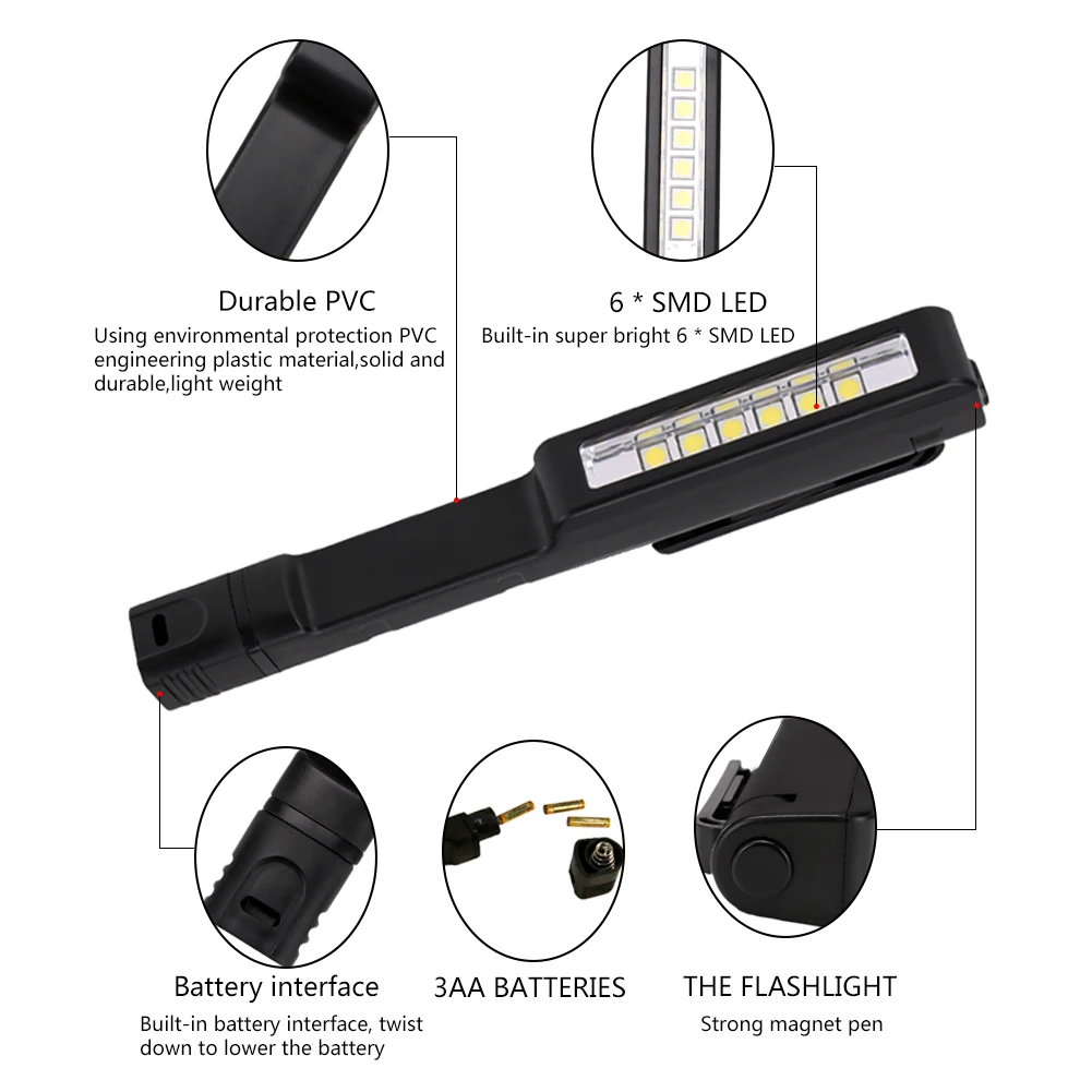 Характеристика: Встроенный супер яркий 6 * SMD СВЕТОДИОДНЫЙ. Отлично подходит для чрезвычайных ситуаций, во время кемпинга или ремонта автомобиля. Супер яркий светодиодный светильник обеспечивает хорошую видимость Только одна модель (вкл/выкл), проста в использовании. Встроенные магниты, могут адсорбироваться на железных изделиях. Питание от 3 * AAA батарей (не входят в комплект). Прочный ПВХ, без стекла, ударопрочный и водостойкий стандарт IPX4. Отлично подходит для ремонта авто и чрезвычайных ситуаций. Спецификация продукта: Материал: ПВХ Размер: 16,2*2,5 см Цвет: черный, красный, синий, желтый Вес: 36 г 1-Модель: вкл/выкл Питание: 3 * AAA батареи (не входят в комплект) Посылка включает в себя: 1 * светодиодный фонарик