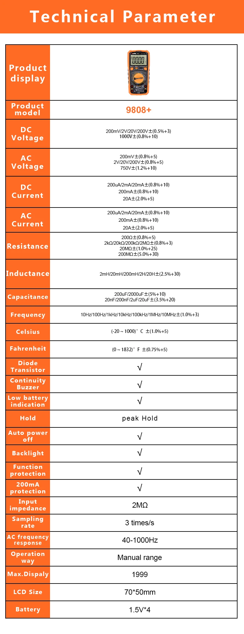 Профессиональный цифровой мультиметр автоматический 9808 + портативный высокой точности 2000 мкФ истинный Rms ток Ac Dc Ncv Авто Диапазон ом тестер