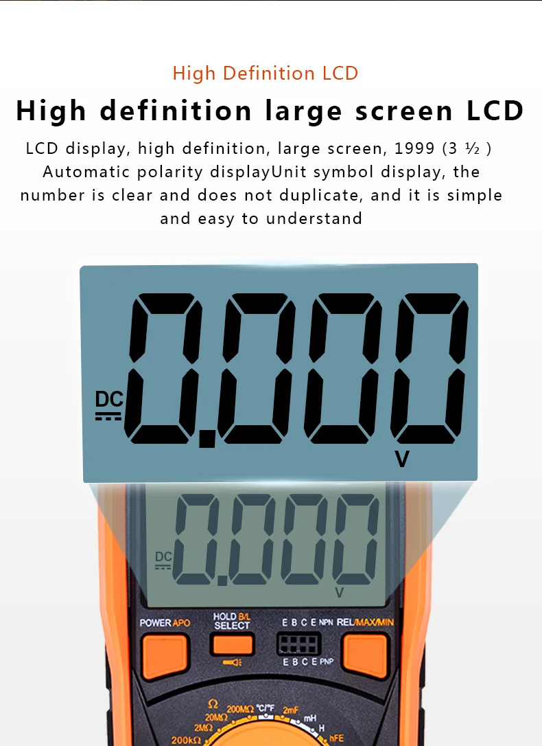 Он использует ЖК-дисплей с размером 70*50 мм, чтобы сделать чтение четким. Символ единицы измеренияОтображение, подсветка и функция защиты от перегрузки делают работуУдобно.Прибор имеет функцию измерения DCV, ACV, DCA, ACA, сопротивления,Емкость, индуктивность, температура и частота, диод, Триод иТест на непрерывность. Инструмент принимает двойной интегральный A/D конвертер в качестве ключевой точки, являетсяОтличный инструмент.Характеристики:1-1.отображение: ЖК-дисплей1-2.макс. Индикация: 2000 отсчетов (3 1/2), автоматическая полярность индикация1-3.метод измерения: двойной наклон A/D1-4.частота выборки: прибл. 3 раза/сек1-5.дальность индикации: MSD отображает «OL»1-6.индикация низкого заряда батареи: отображение символа1-7.операция: 0 ~ 40 ℃, относительная влажность <80%1-8.Power: 1,5 V AAA * 4 шт Батарея (не входит в комплект)1-9.размер: 190 × 88,5 × 27,5 мм1-10. Вес: около 422g (без батареи)Характеристики: