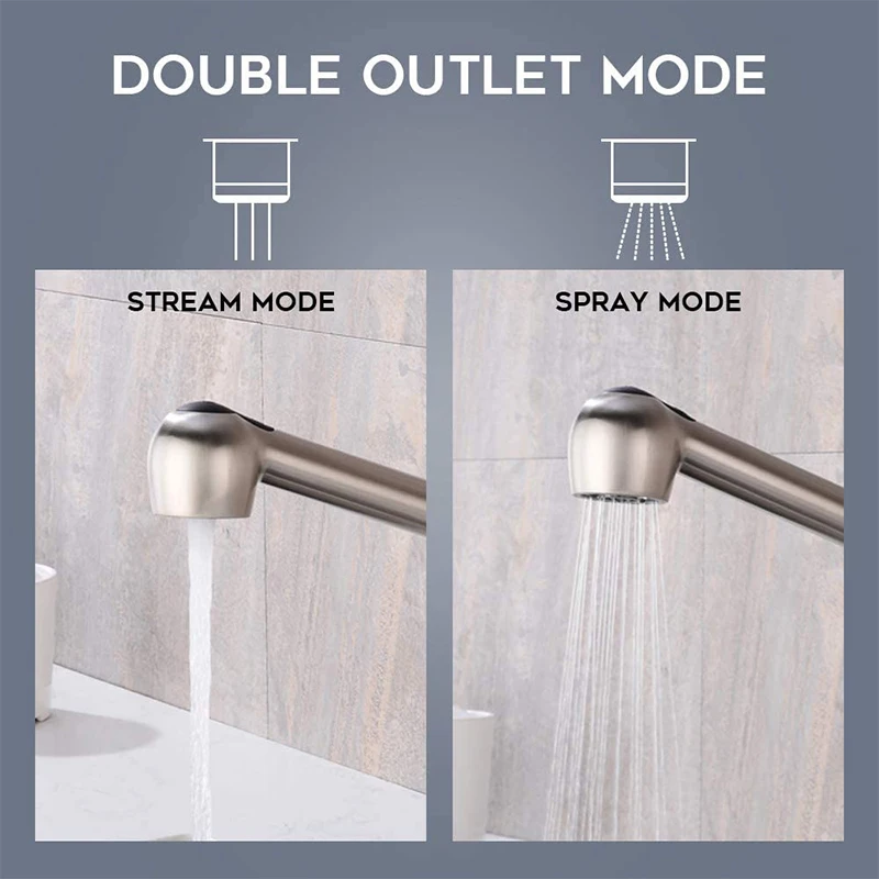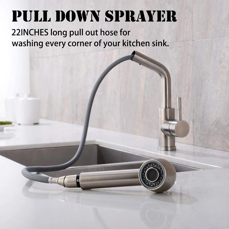 Высокое качество и надежность -- кухонные краны изготовлены из пищевой нержавеющей стали 304. Не беспокойтесь о свинце. Выдерживает высокую температуру 110 ℃. Матовая никелевая поверхность легче очищается и устойчива к коррозии. Керамический сердечник клапана может в 500000 раз открывать и закрывать. С водонепроницаемой прокладкой, без протечек, стабильное давление. Идеальный дизайн-кухонный кран из нержавеющей стали с высокой дугой обеспечивает достаточную высоту для наполнения и очистки больших раковин и кувшин. Поток воды находится прямо в середине раковины, без брызг. Вращающийся на 360 градусов корпус больше подходит для двойных раковин. Ручка качается на 90 градусов влево и вправо, чтобы переключить горячую и холодную воду. Гибкий вытяжной шланг-внутренний шланг PEX, может выдерживать тяжелые скручивания, перетаскивания или запутывания при ежедневном использовании по сравнению с пвх и EPDM. Вес может автоматически отрегулировать головку распылителя. 22 дюймовый шланг можно мыть по углам раковина без каких-либо усилий. Две функции -- поток для заполнения воды, спрей для сильной очистки. Кнопка управления одной рукой, легко переходит от аэрированного потока к мощному распылению.