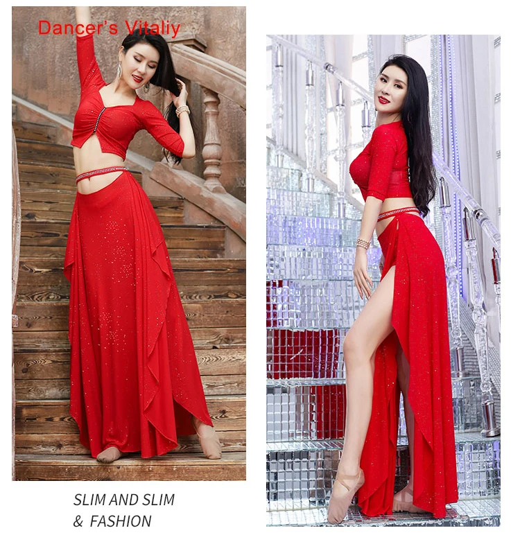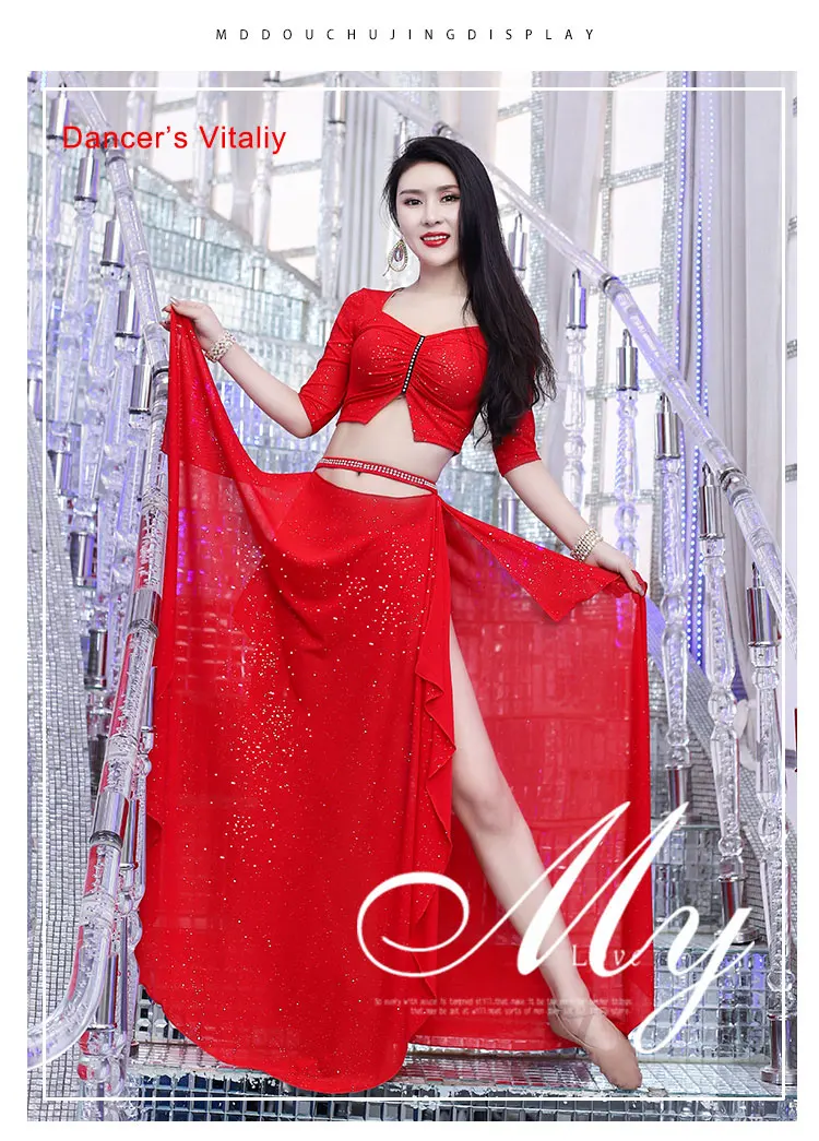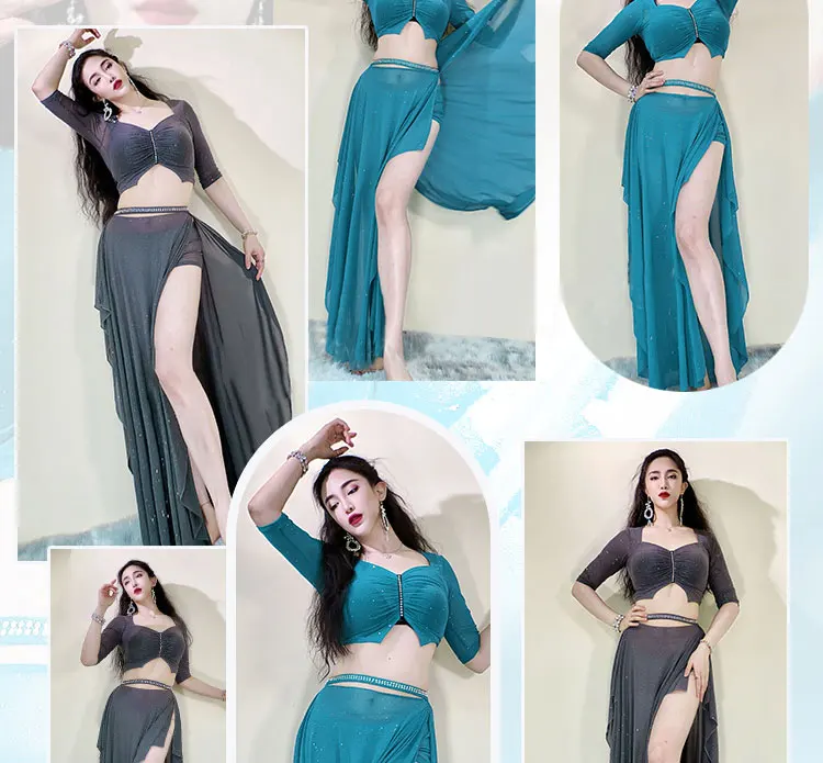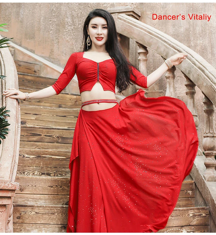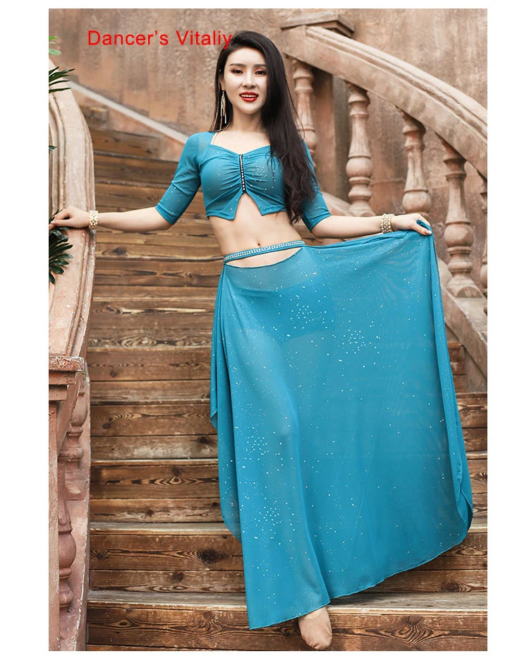 Костюм для восточного танца: топ с V-образным вырезом из сетки и полурукавами юбка блестками комплект одежды женщин репетиций элегантных выступлений - купить