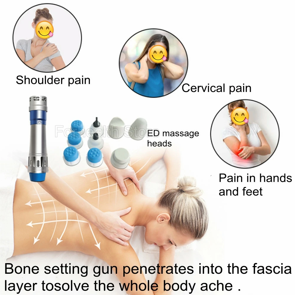 Shockwaveis своего рода волна, которая может заставить давление быстро увеличиваться за короткое время и медленно уменьшаться за промежуток времени. Цель этого инструмента-действовать на части человеческого тела, которые подвергаются боли в течение длительного времени. Принцип ухода за ударными волнами заключается в облегчении боли, стимулируя осаждение и растворение кальция, а также улучшая кровообращение.