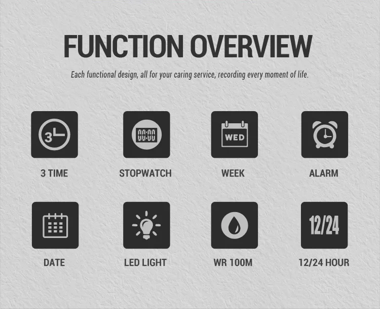 8. Функции: 3 времени, хронограф, будильник, неделя, дата, светодиодная подсветка, 12/24 часов