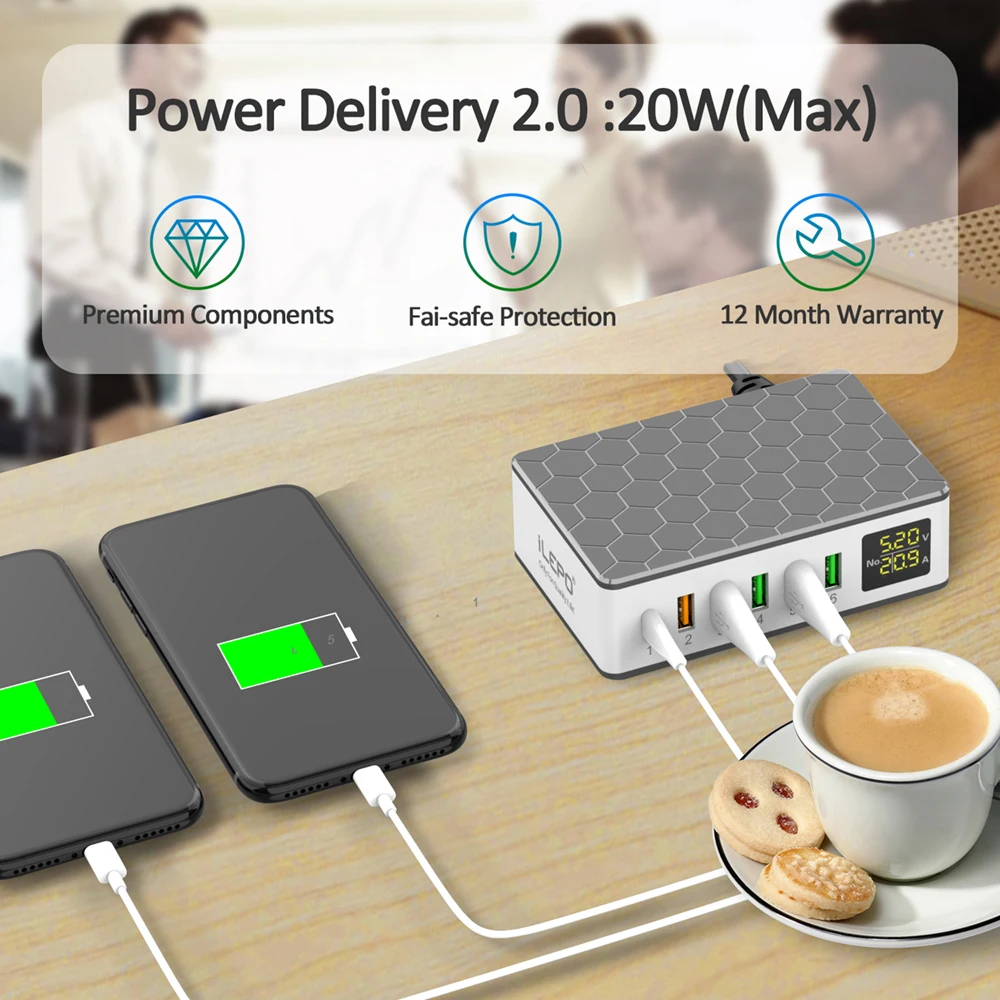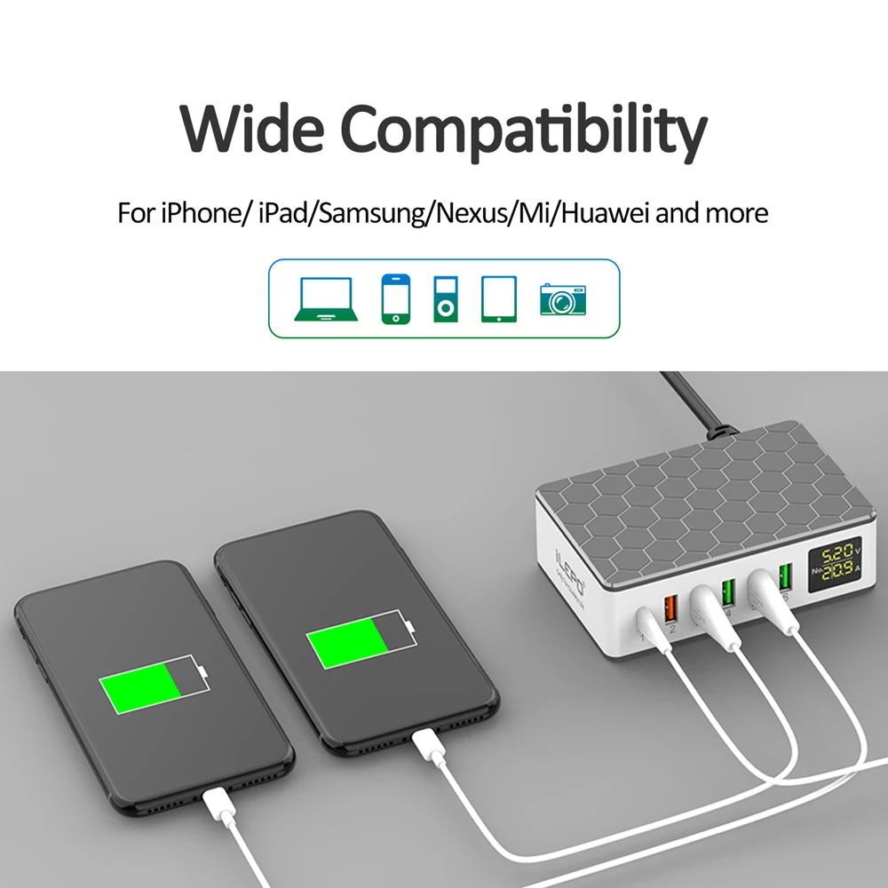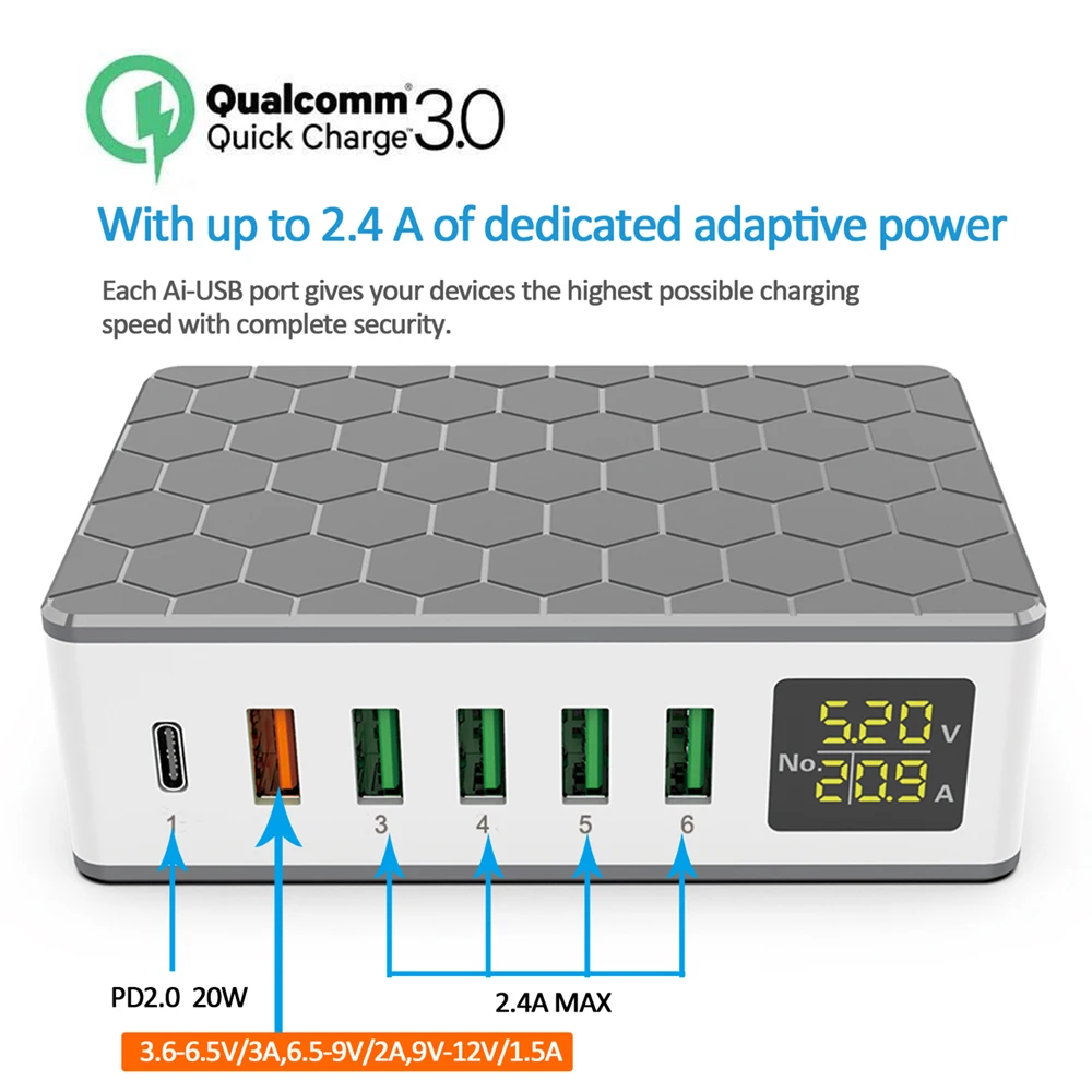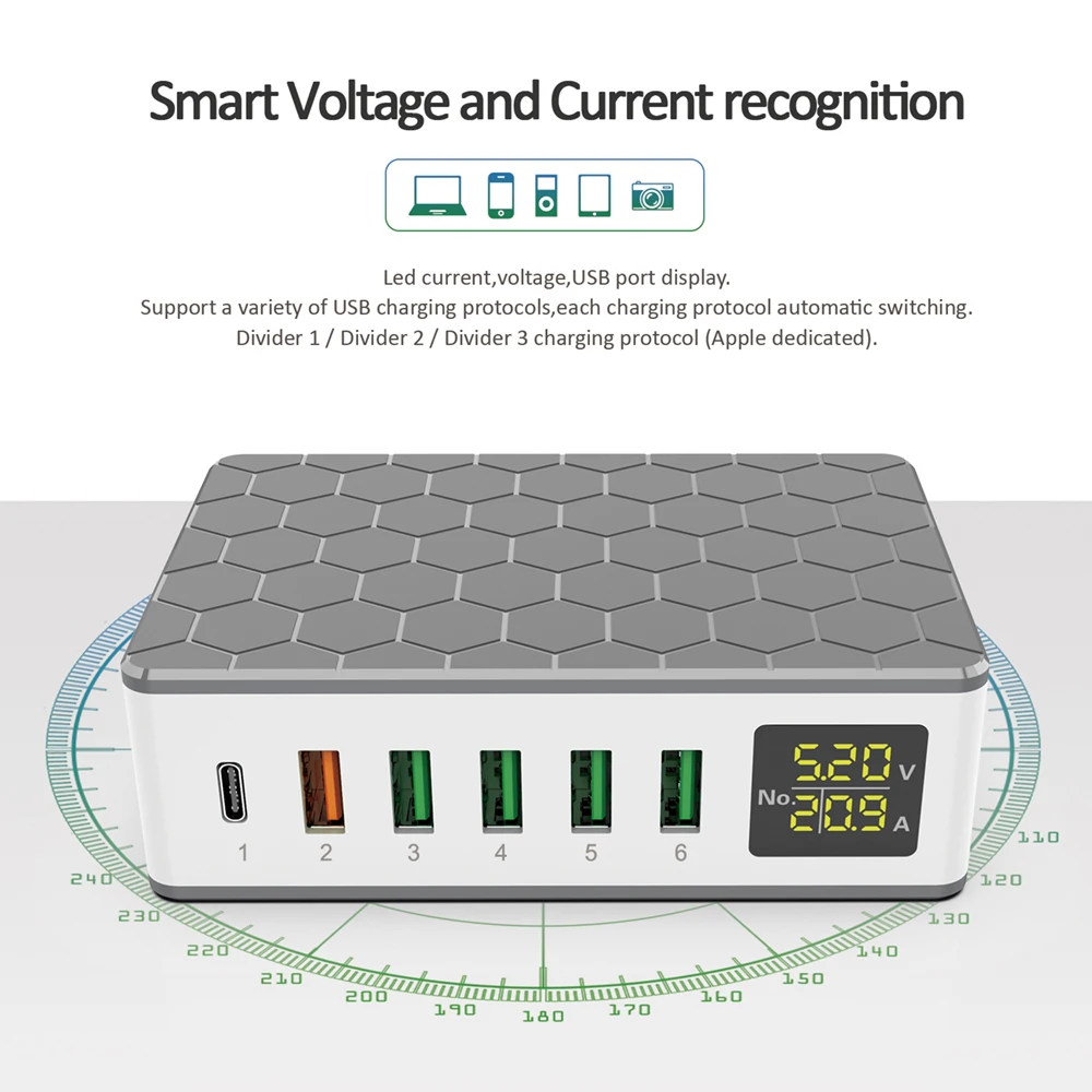 ILEPO 6 портов USB зарядное устройство Тип C PD зарядное устройство умный цифровой дисплей 65 Вт QC3.0 быстрая зарядная станция для iPhone Samsung Sony HUAWEI