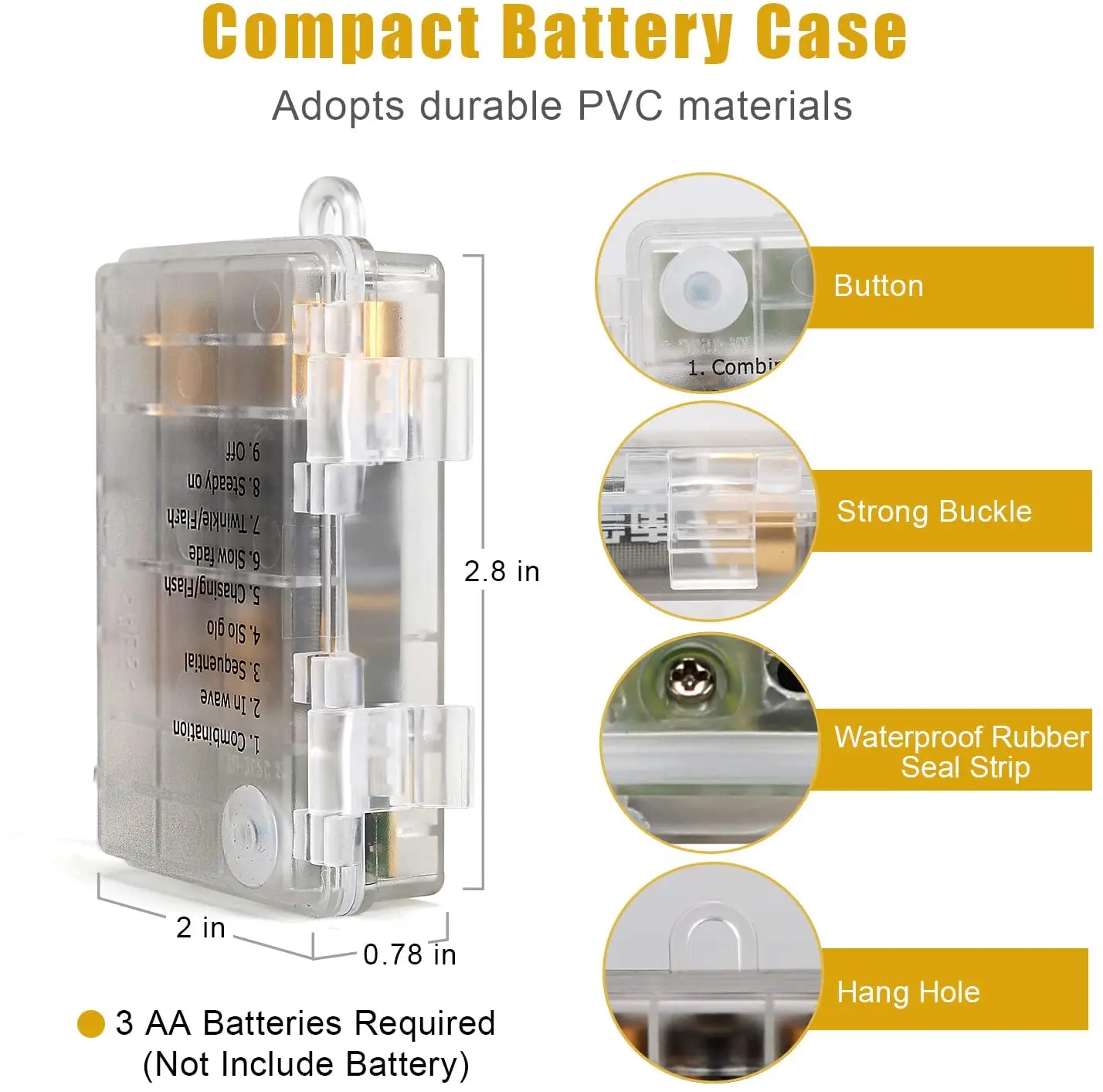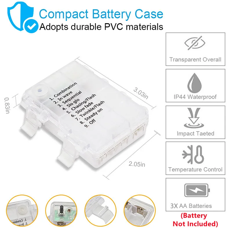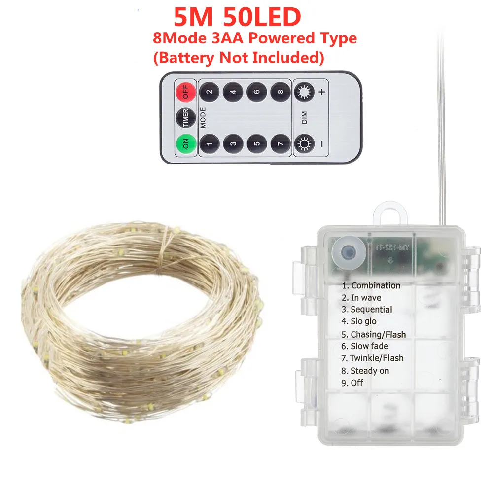 Характеристика: * Гирлянда с батарейным питанием и технологией дистанционного управления. * Гирлянда на батарейках с функцией синхронизации. * 8 режимов, управляемых кнопкой батарейного отсека и беспроводным ручным пультом дистанционного управления. * Настраиваемая яркость на батарейках. * Настоящая Водонепроницаемая Батарейная коробка. Параметры Количество СВЕТОДИОДНЫЙ: 50 шт/100 шт Длина: 5 метров/10 метров Напряжение питания: 4,5 V Рабочая мощность: 5 Вт-8 Вт ts Материал свинца: медная проволока Водонепроницаемость: IP65 Led Цвет: теплый белый/многоцветный/синий Питание: 3 батарейки типа АА (не входят в комплект) Аккумулятор пульта дистанционного управления: 1 шт. CR2025 (не входит в комплект) 8 режимов 1. Комбинация 2. В волне 3. Последовательный 4. Переменный 5. Чеканка/вспышка 6. Медленное выцветание 7. Мерцание/вспышка 8. Стабильный Таймер: контроль времени, включение 6 часов и выключение 18 часов циркулярно каждый день тусклый-: темнеет +: осветляет Посылка включает в себя: 5 м или 10 м медный провод светодиодный светильник с пультом дистанционного управления
