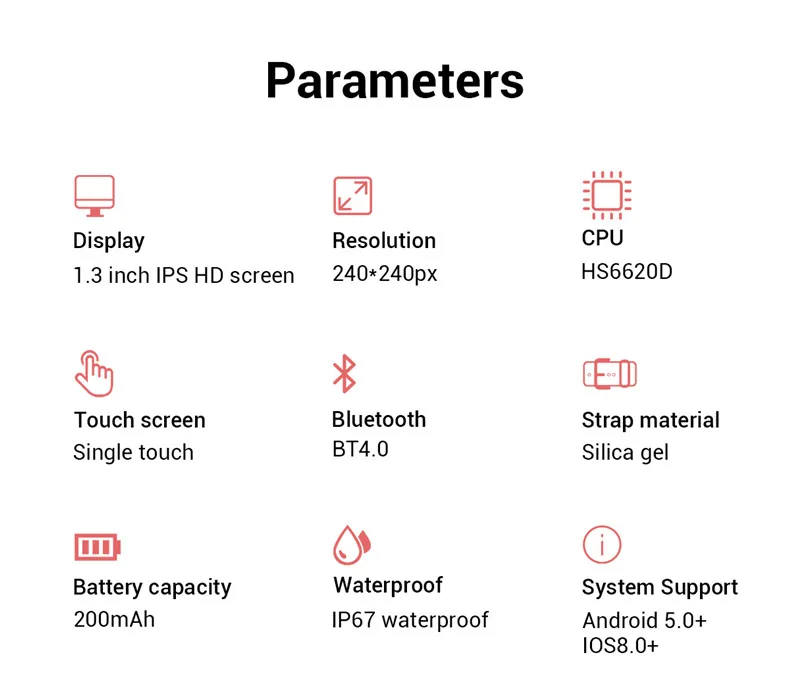 -Дисплей: 1,3 IPS настоящий цветной экран, разрешение 240*240 квадратный дисплей-Циферблат: поддерживает 3 циферблата-Определение частоты сердечных сокращений: поддержка динамического частоты сердечных сокращений-Мульти-спортивные режимы: ходьба, бег, Велоспорт, бадминтон, скакалка, баскетбол, футбол, плавание-Обнаружение кислорода в крови: поддерживает красный свет и инфракрасный датчик света для измерения насыщения крови кислородом-Обнаружение сна: Поддержка-Погода: автоматически обновляется каждый час-Вызов и SMS содержание push: с отдельно переключателем-Сообщение push: есть отдельные переключатели. (Информация включает WeChat, QQ, facebook, Twltter,whatsapp, line, Instagram, skype, kakao, другие)-Удаленная Камера: Откройте камеру на мобильном телефоне, нажмите на интерфейс камеры на браслете, чтобы сделать снимок-Напоминание о малоподвижности: поддержка (требуется приложение, вибрация)-Отклонение вызова: Поддержка-Секундомер, обратный отсчет: настройки приложения постоянные и одиночные-Система переключения: 24/12-часовом формате системы, расстояние от британского метрическая система (требуется приложение)-Регулировка яркости: Поддержка-Языки браслета: китайский, английский, французский, испанский, японский, русский, португальский-Функция кровяного давления: обычная функция кровяного давления-Предупреждение о травле: в напоминании о вызове, он может напоминать, является ли вызов тревожным вызовом-Найти браслет: Поддержка-Сенсорное управление: одноточечный сенсорный экран-Подсчет шагов, пройденное расстояние, калории: приложение поддерживает синхронизацию данных на браслете и сохраняет записи-Сон: Синхронизация данных браслета и анализ качества сна-Частота сердечных сокращений: после подключения браслета, вы можете включить ручное обнаружение на стороне приложения, синхронизировать данные браслета и анализ данных сердечного ритмаРучное обнаружение на стороне приложения, синхронизация данных браслета и анализ-SpO2: после подключения браслета, вы можете открыть ручное обнаружение на стороне приложения, синхронизировать данные браслета и анализ-Языки приложения: упрощенный китайский, традиционный китайский, английский, немецкий, французский, испанский, корейский, японский, русский, украинский, арабский, тайский, португальский, итальянский-Настройка будильника: напоминание о вибрации браслета-История: пульс, сон, упражнения-Обмен здоровьем: делитесь на WeChat, QQ, Facebook, Twitter, whatsapp-Поддержка мобильной версии: Поддержка мобильной версии iOS 9,0 или более поздней версии Android 4,4 или более поздней версии