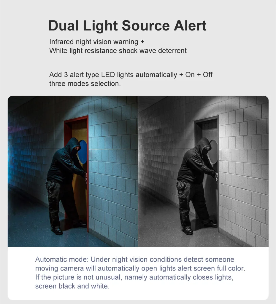 Описание:1: оснащен ультраширокоугольным объективом высокой четкости 150 °, область ухода более открытая, уменьшая слепые пятна2:Светодиодный светильник 3 типа предупреждения, Автоматическое включение выключение трех режимов.Автоматический режим: при ночных условиях, когда кто-то движется, камера автоматически включит светильник и изображение будет полным цветом. Если изображение нормальное, светильник автоматически отключаетсяИзображение черно-белое.Режим выключения: Светильник выключен, а изображение-черно-белое ночное видениеРежим включения: 3 светодиода всегда будут включаться, и экран будет в ночное время продолжать поддерживать полный цвет3: встроенный 4 мощных инфракрасных фонаря ночного видения, исследуя темную ночь, в чехол человеческий глаз не может быть слеп, также можно точно получить четкие изображения4: обнаружена аномалия, и в режиме реального времени на мобильный телефон поступает сигнал тревоги5: Встроенный громкоговоритель высокой мощности и высокочувствительный микрофон, дистанционное общение в любое время, в любом месте, внутри и снаружи.Примечание: Эти камеры были модернизированы до 2K качества