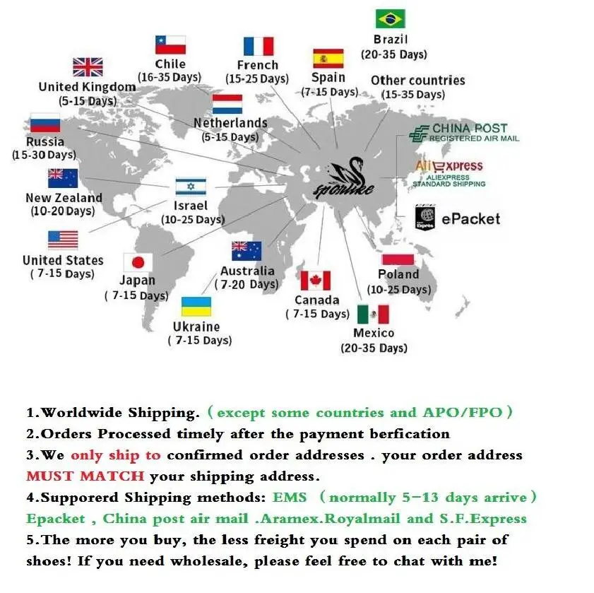 1. Время подготовки: нам нужно 1-3 рабочих дня, чтобы подготовить ваш заказ в соответствии с нашими многочисленными заказами каждый день. 2. Пожалуйста, дважды проверьте свой адрес, когда вы пишете в aliexpress, если вы хотите изменить, прежде чем мы отправим их, пожалуйста, свяжитесь с нами.