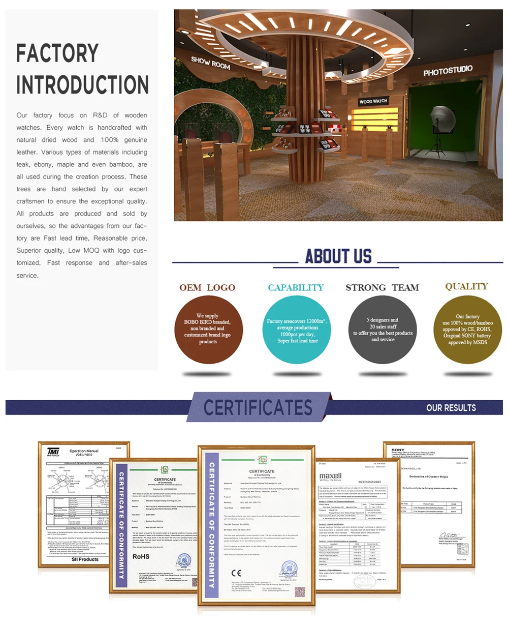 BOBO BIRD фокусируется на исследованиях и разработке деревянных часов. Все часы изготовлены вручную из натурального сухого дерева и 100% натуральной кожи. В процессе творчества были использованы различные виды материалов, включая тик, эбеновое дерево, клен и даже бамбук. Эти деревья выбираются вручную нашими профессиональными мастерами для обеспечения превосходного качества.Мы торгуем фабрикой, и вся продукция производится и продается нами. Поэтому преимущества нашей фабрики-это быстрая доставка, разумная цена, высокое качество, минимальный заказ 1 шт. с индивидуальным логотипом, быстрый ответ и послепродажное обслуживание