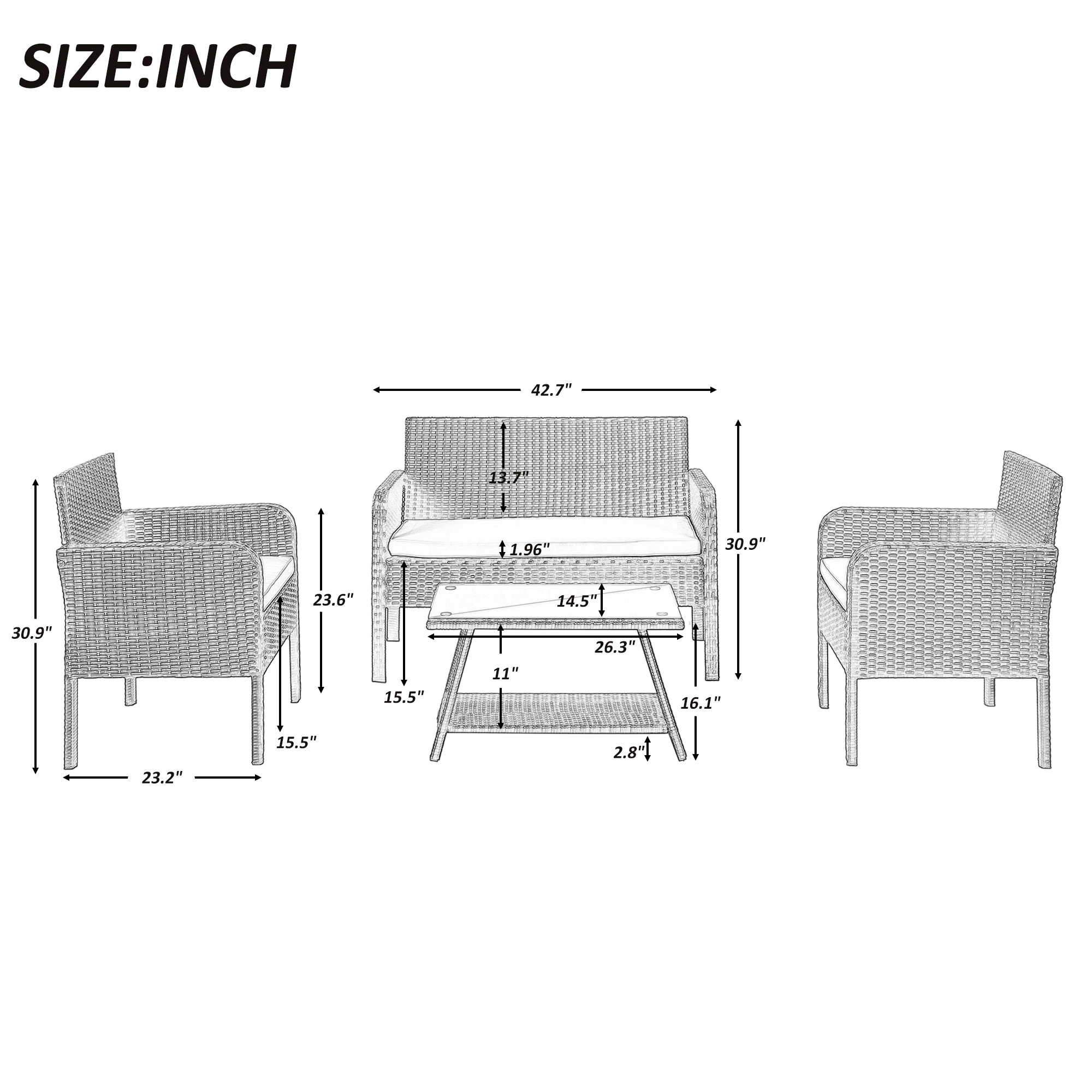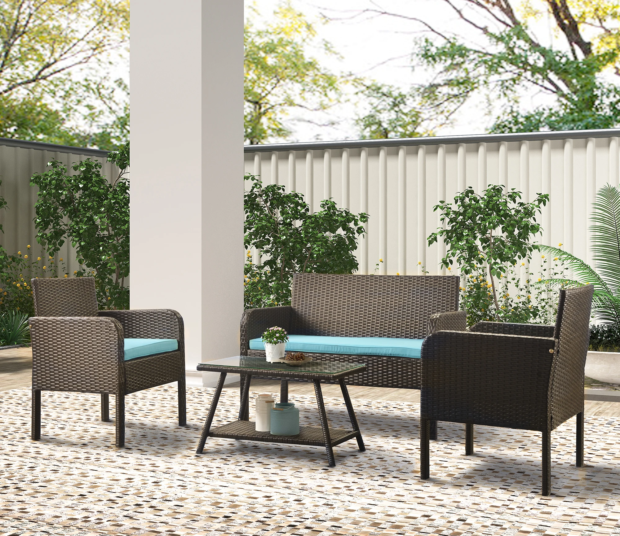 Description4 Pcs Patio Furniture Set Outdoor Rattan Sofa Seating Group Include 1 Sofa 2 Chair 1 Coffee Table Beige/Blue Cushions[US-Depot]DescriptionTake an elegant approach when it comes to furnishing your backyard or patio. Complete with 4 pieces, this set can seat a total of 4 people, coming with 2 chairs and a loveseat. Outfitted with soft foam cushions this, patio set offers the perfect blend of comfort and charm, also boasting rich cobalt blue cushion upholstery that is easy to spot clean and has been double stitched for maximum durability. The gradient commercial grade rattan has been formulated to be weather proof to prevent untimely cracking, fading, rot and more adding to overall longevity. Enjoy the center coffee table and entertain guests with food and drinks with its shatter resistant tempered glass top.