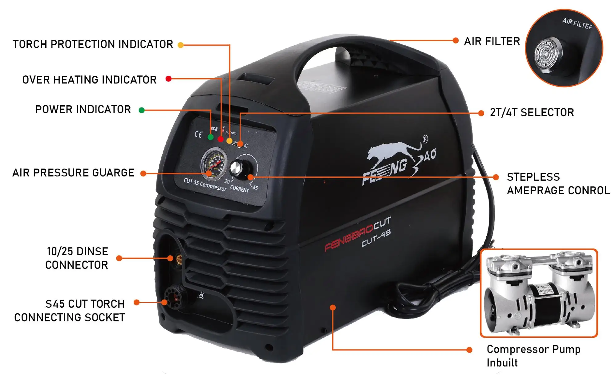DECAPOWER CUT-45 KOMRESSOR-это машина плазменной резки на инверторной основе, произведенная по новейшей технологии IGBT. Эта машина надежна, надежна и сложена с функциями, которые вы можете ожидать от качественного плазменного резака. Компрессор CUT-45 производит высокотемпературный плазменный поток, обеспечивающий легкость резки всех электропроводящих материалов, включая сталь, чугун, нержавеющую сталь, медь, алюминиевую латунь и т. д. Крой-45 компрессор оснащен высокого качества S45 плазменный фонарь с евро соединения, разработанный специально для увеличения и для того чтобы улучшить качество реза резки машина. Соединение S45 плазменный фонарь обеспечивает легкий запуск резки с мощной, быстрой и точной возможностью резки, дополнительно является преимуществом более длительного срока службы расходных электродов и кончиков резки.