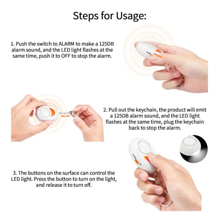 1. Простой в эксплуатации, вытяните штырь, чтобы вызвать звуковой сигнал, и светодиодный светильник одновременно начнет мигать, нажмите на штырь обратно, чтобы остановить.2. Громкая сигнализация 125 дБ может привлечь внимание других, позволяя вам обратиться за помощью в чрезвычайной ситуации.