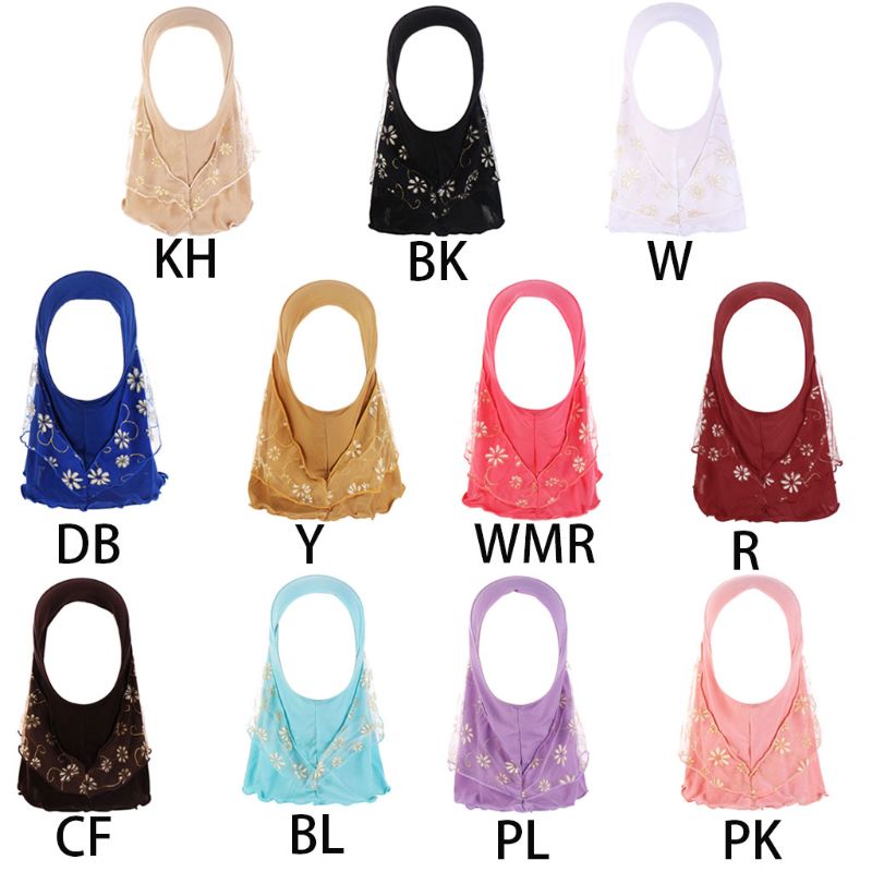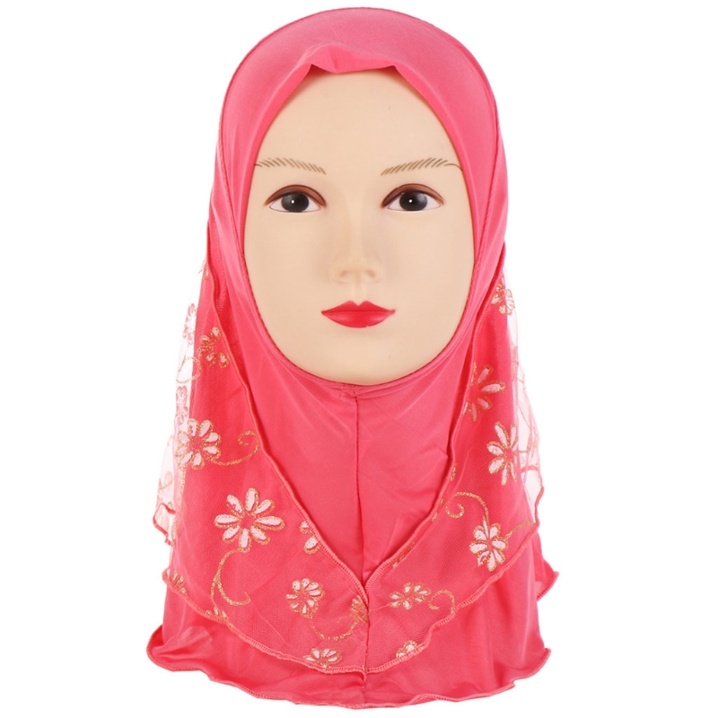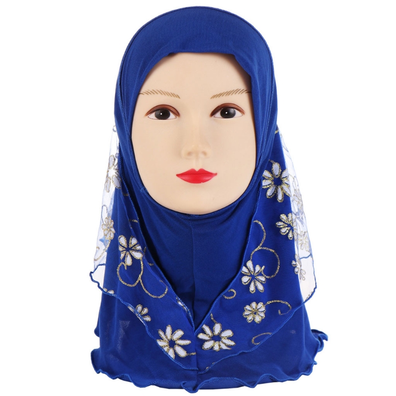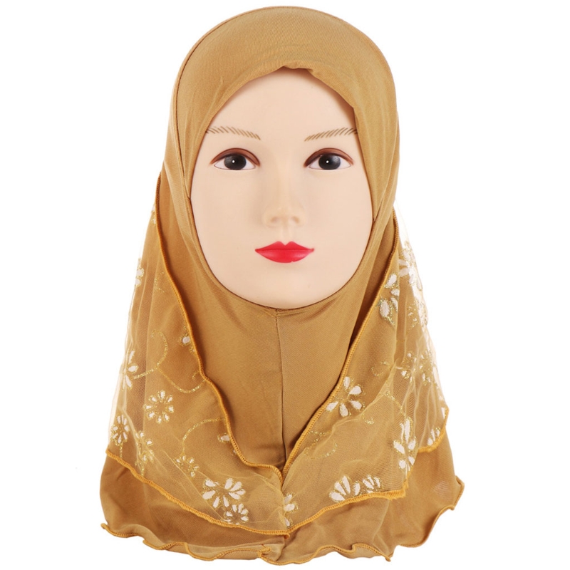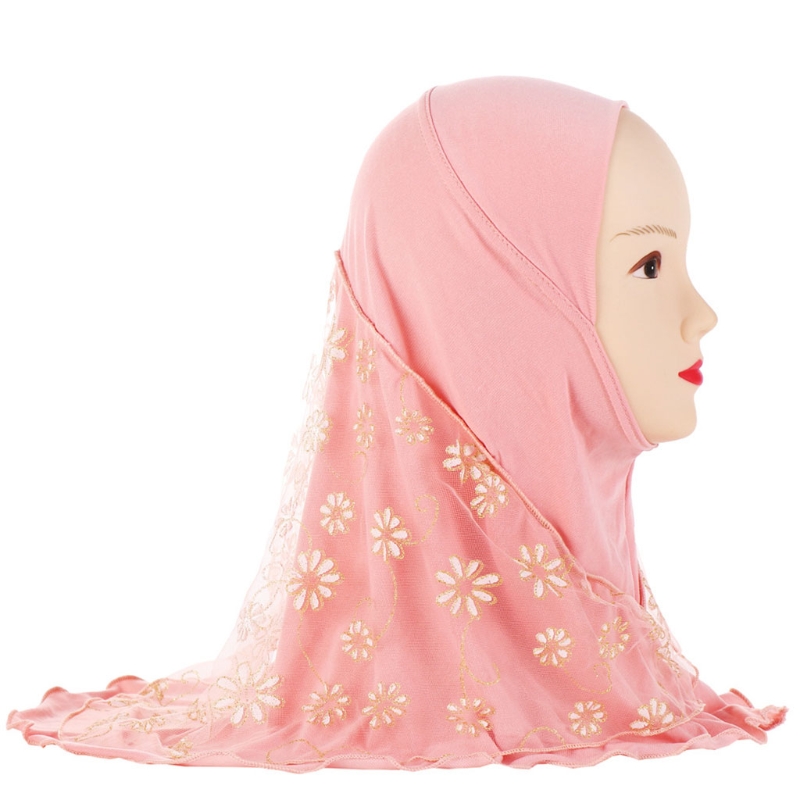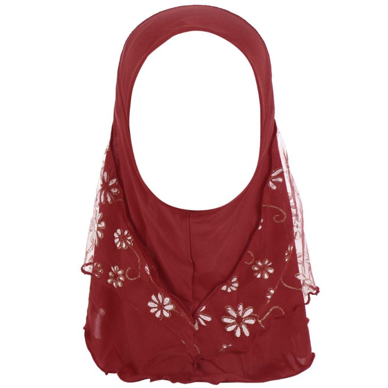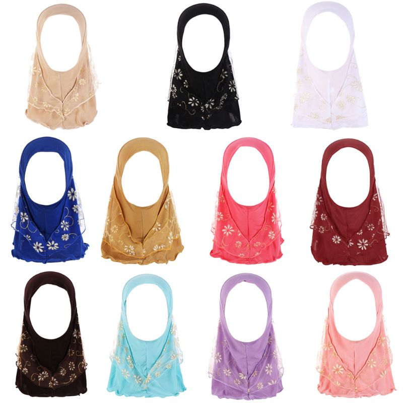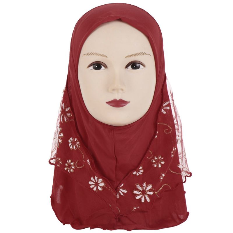 Детский мусульманский хиджаб для маленьких девочек с кружевным цветочным узором, исламский шарф, шали, растягивающиеся 56 см, От 7 до 11 лет