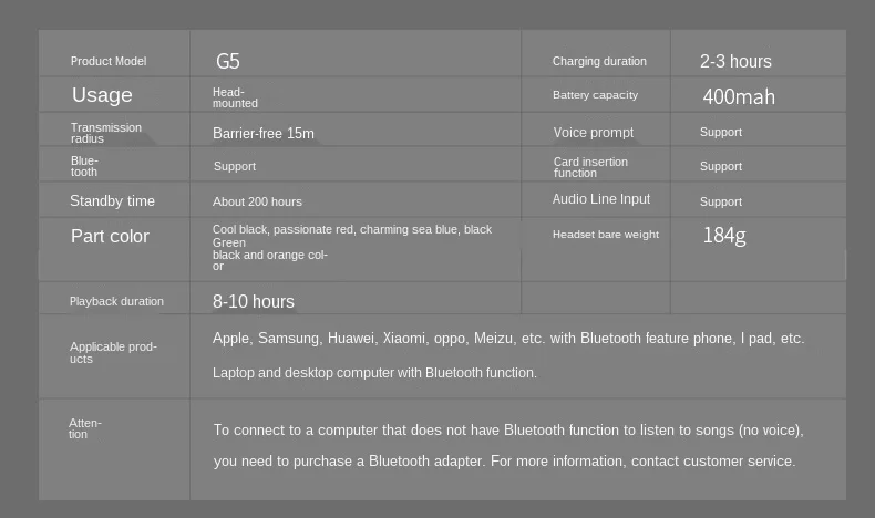 G5-это высококачественная Беспроводная bluetooth-гарнитура, специально разработанная для качества звука и комфорта 1. С 3,5 мм аудио aux кабель, он может поддерживать беспроводных и проводных операции, избежать конфуза, когда она не в состоянии использовать без power2. Поддержка режима расширения tf-карты, максимальная поддержка 32g, позволяет вам легко иметь свой собственный музыкальный library3. Очень мягкие наушники из искусственной кожи делают ношение более комфортным и безболезненным 4. Высокое качество 40 мм катушка, идеально восстанавливает самый настоящий мусикс 5. Сабвуфер позволяет вам погружаться в hifi все время 6. Легко установить режим подключения Bluetooth, который может подключить несколько мобильных телефонов в то же время 7. Уникальный дизайн шумоподавления может изолировать вас от внешнего микрофона Bluetooth interference8.5.0 делает передачу более стабильной, более быстрой и устраняет delay9. Встроенный микрофон HD, чтобы сделать общение более приятным, аккумулятор большой емкости 10,400 мАч, больше не беспокойтесь о не power11. Складная конструкция, больше места 12. Управление нажатием кнопки, чувствовать себя лучше, слепое управление более удобно 13. Разные цвета, всегда подходят для вашей индивидуальности.