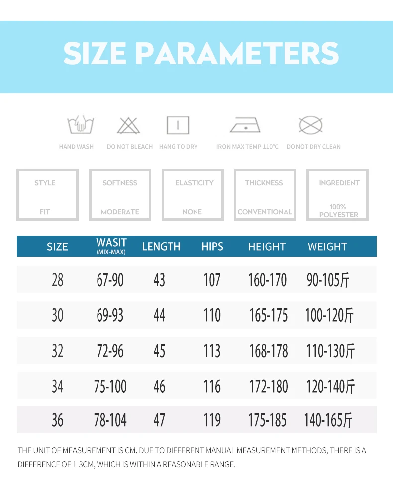 Внимание: 1. Товар азиатского размера, как правило, на 2-3 размера меньше размера EU/US. 2. Пожалуйста, учитывайте разницу в цвете из-за некоторых причин, таких как отражение цвета В мониторе, освещении, фоне и т. д. Единица измерения: см (1 дюйм = 2,54 см, 1 см = 0,393 дюйма) Размер 28, рекомендуется для 45-50 кг Размер 30, рекомендуется для весов 50-55 кг Размер 32, рекомендуется для 55-65 кг Размер 34, рекомендуется для 65-75 кг 36 Размер рекомендуется для 75-80 кг