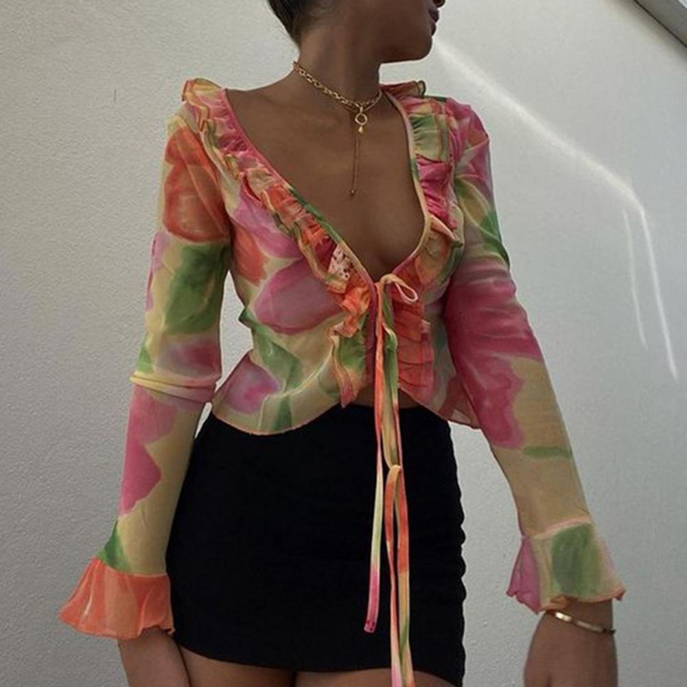 Купить Модная богемная блузка с рюшами просвечивающее кружево v образным вырезом топы