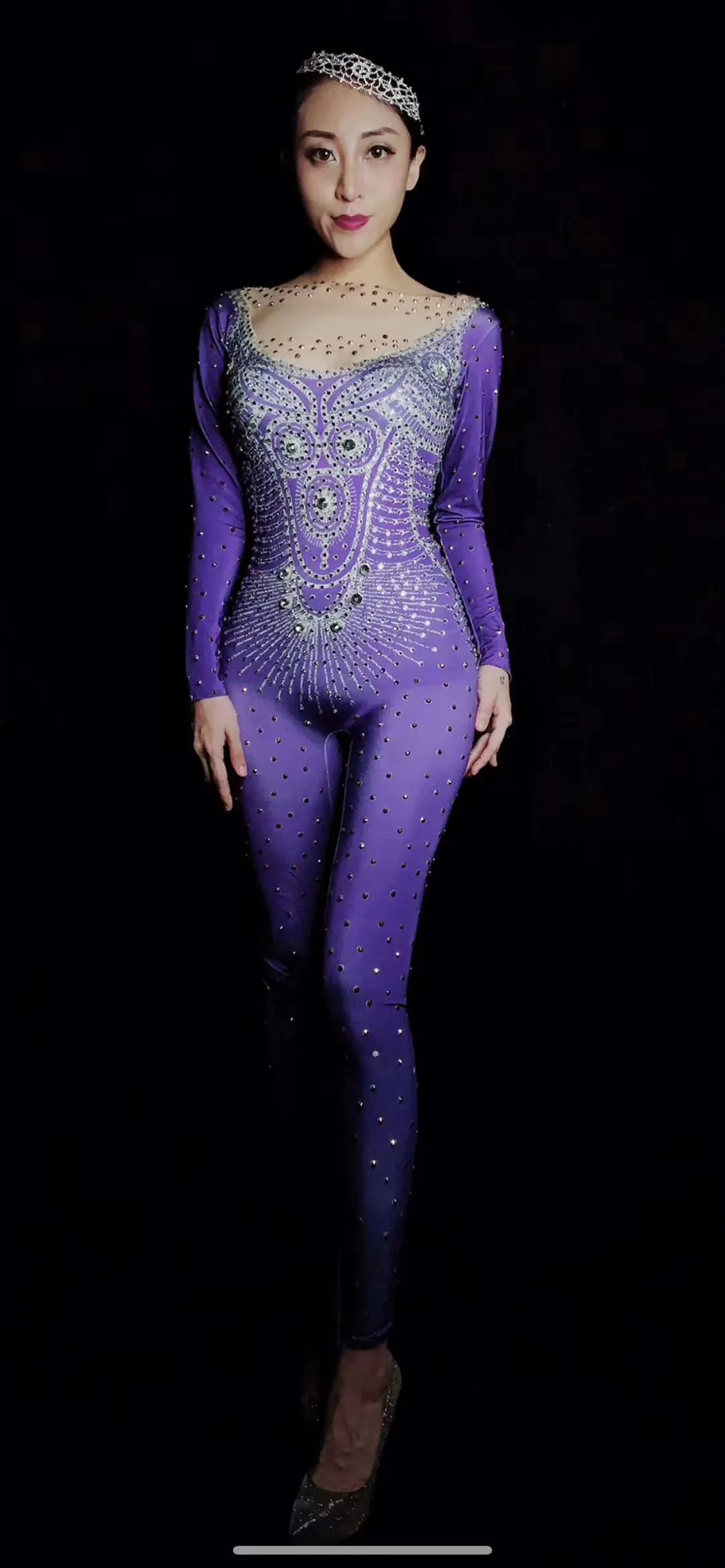 Отзывы о Блестящее трико стразы комбинезон Фиолетовый с длинным рукавом для диджея