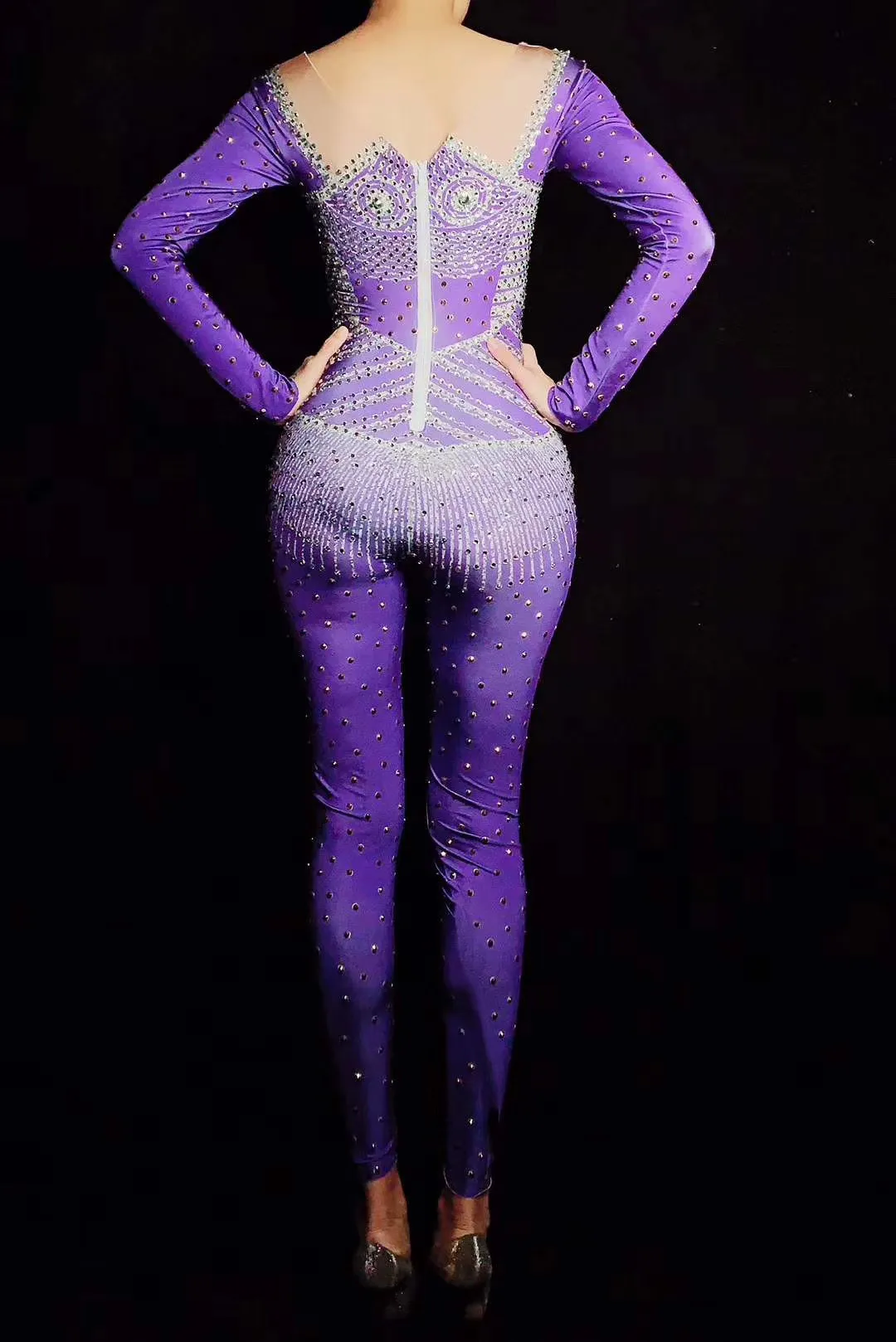 Блестящее трико стразы комбинезон Фиолетовый с длинным рукавом для диджея - купить