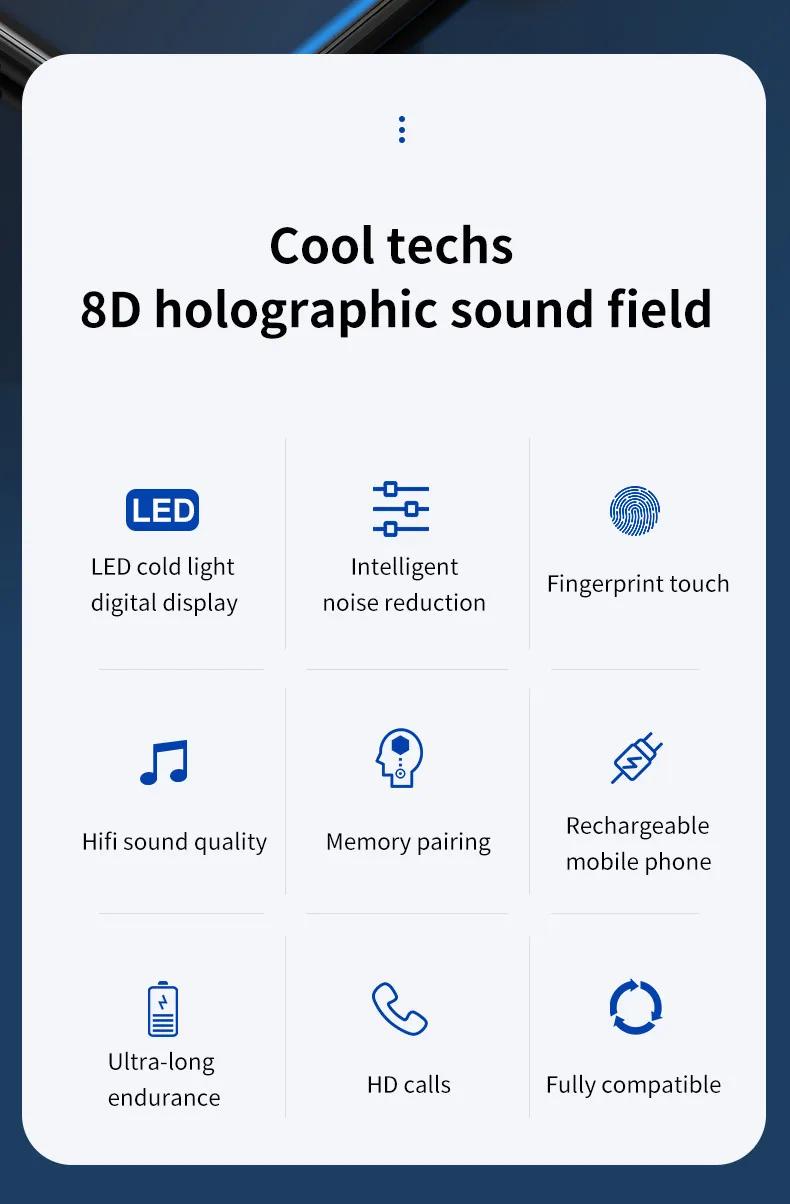 4. Зарядная кабина большой емкости: Может использоваться для хранения наушников, зарядка для наушников/мобильного телефона в качестве держателя мобильного телефона5. Наслаждайтесь и 9D тяжелыми басами: Наслаждайтесь HIFI sceneand enioy иммерсивным 9D стерео эффект окружения звука6. Интеллектуальное шумоподавление CVC80: Наслаждайтесь эффектами HD вызовов без воздействия шумной среды7. Сильная Совместимость: независимо от брендового мобильного телефона и модели, устройства с поддержкой Bluetooth могут использовать эту гарнитуру