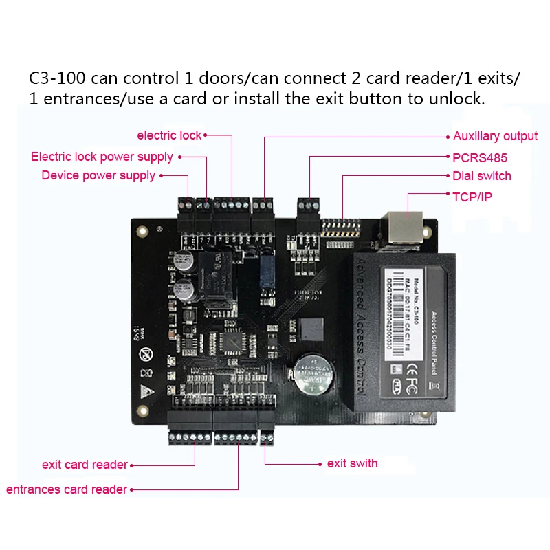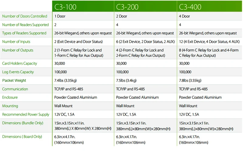 There are over-current protection, over-voltage protection, reversal protection for the power supply and all the input and output terminal.2.Integration with Other Security SystemsC3 can be integrated with other security systems such as CCTV, fire alarm, BAS(building automation system) and other systems to configure total security system.3.Supports different Wiegand readerThe controller support different wiegand format, and can Connect to different reader, including ID card reader, MF card reader and HID reader etc.4.Input/Output Ports to Control Doorsconnect with variety of sensors, alarms, exit buttons, electric lock and other devices.5.Variety of Communication FunctionUsing either serial or TCP/IP communication, it provides reliable network system6.B/S structure softwareIt is easy to manage the system by browser from client PC.7.Normal open after first punch card can be setup.Real-time Monitoring of Door statusUsing the management software, it allows real-time monitoring and control of door opening and closing of the whole system.8.Simple Access Control System Configuration9.Interlock functionLink different doors with special logic that one door is Open, others should be closed.10.Multi-card operationThis function is used to manage visitors or to manage some special high secure place. The doors are opened when appointed number registered cards are read together.11.Anti-Passback12.Duress Mode13.SDK availableThe system integrator can use the SDK to integrate the hardware into their existing access control software system or to develop a new software.Specifications: