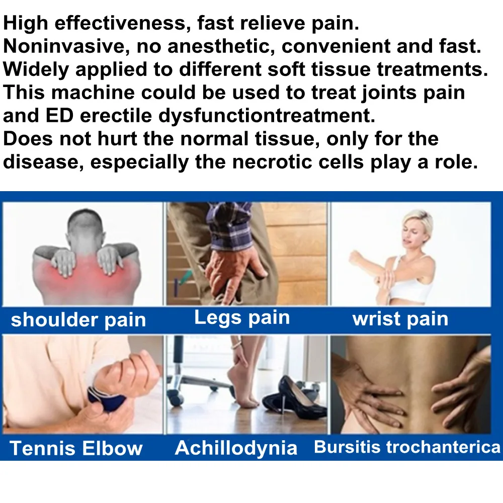 Характеристика: 1. Ударная Волна хорошо определена и оказывает минимальное воздействие на окружающие ткани. 2. Стимулирует акупунктурный эффект, улучшает микроциркуляцию, улучшает кровообращение, способствует метаболизму клеток. 3. С 7 массажными головками, он подходит для различных частей тела и отвечает вашим потребностям. 4. Терапевтическая машина Shockwave, максимальная энергия 250MJ и 16 частотных передач. 5. Проницаемость клеточной мембраны усиливается за счет увеличения активности ионного канала, содействия делению клеток и стимулированию производства цитокина.