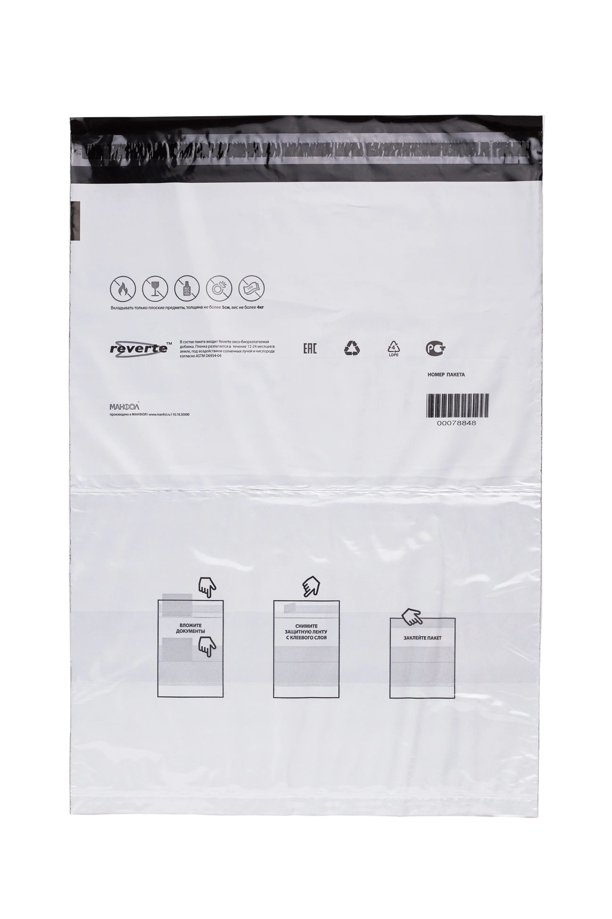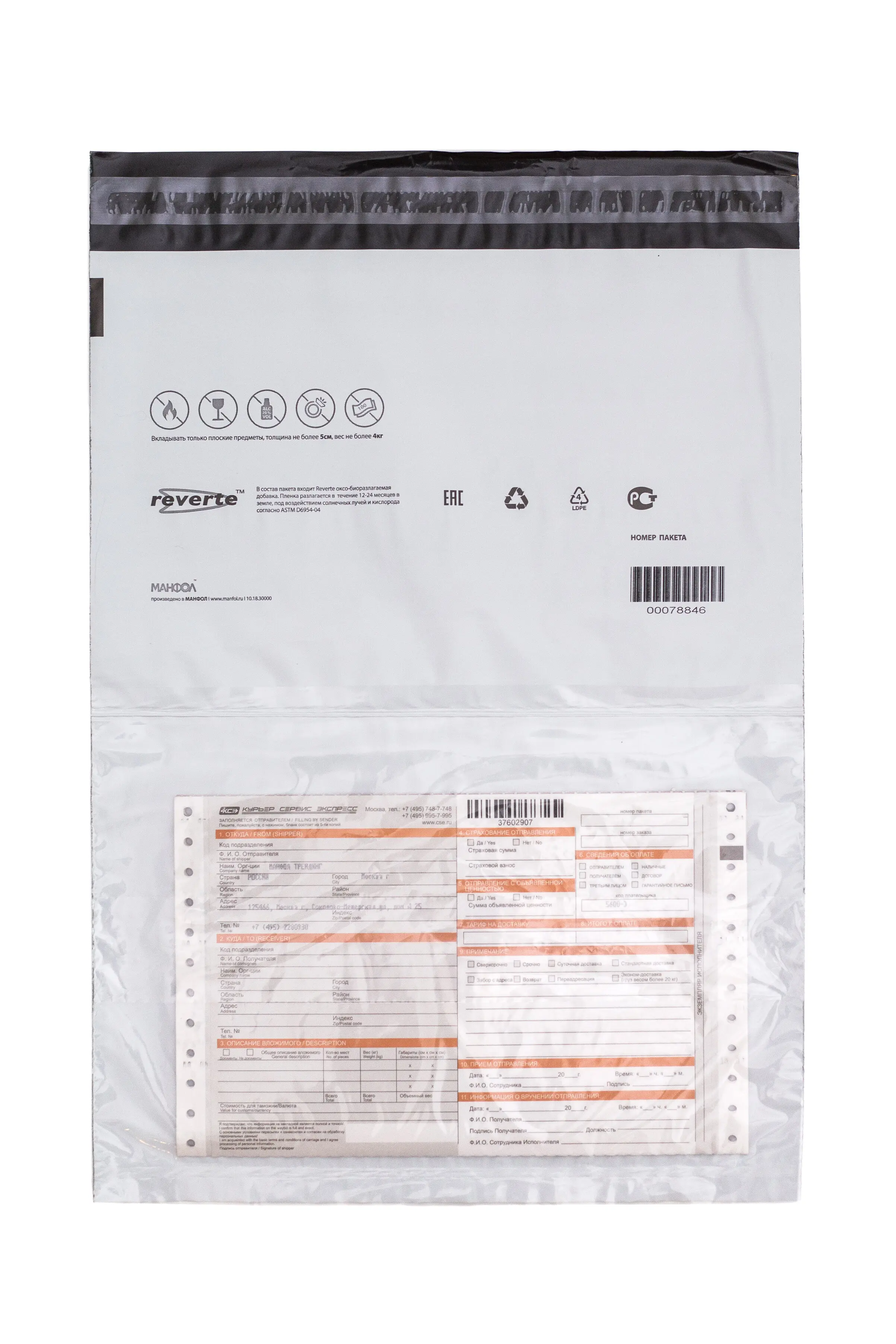 В добавок каждый пакет имеет индивидуальный штрих-код, который позволит отследить Вашу посылку и проконтролировать благополучную доставку получателю. Для защиты Ваших отправлений наши курьер пакеты устроены так, что любое несанкционированное вскрытие будет выявлено.