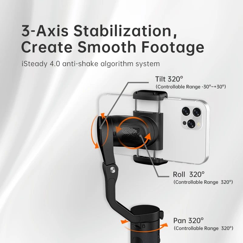 iSteady X2 has 10 hours battery life supports emergency charging of mobile phones and other electronic devices.