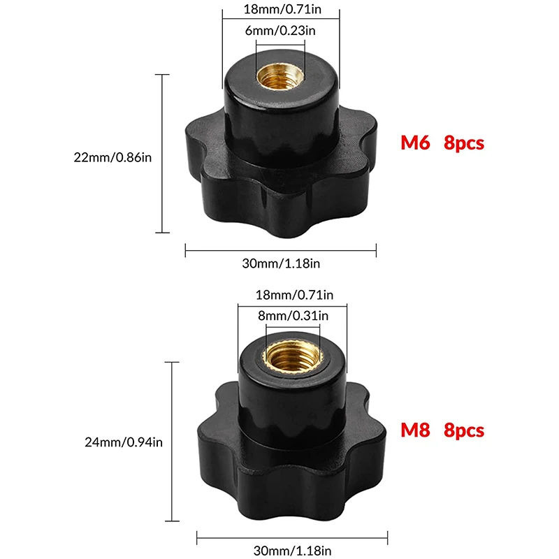 [2 широко используемых размера] вы получите 16 зажимных ручек в форме звезды, в том числе 8 звездочных ручек M6 и 8 звездочных ручек M8. Обычно используемые размеры подходят для многих видов механического оборудования, достаточно для ежедневного использования и замены.
