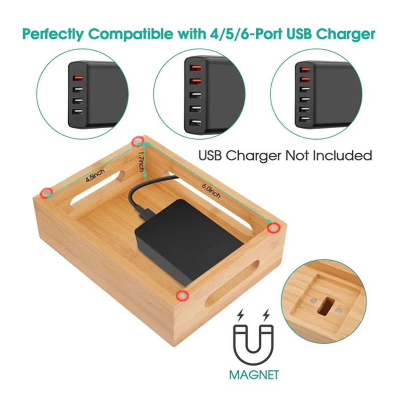 Бамбуковая многофункциональная зарядная станция и док-станция-это идеальные настольные аксессуары для ваших технических проблем. Достаточно места для хранения двух планшетов и до четырех других мобильных устройств, таких как смартфоны и часы или Airpods. В нижней части зарядной станции имеется магнитное основание, которое открывается, чтобы открыть скрытую зону хранения для организации проводов, которые в противном случае могут загромождать место на вашем столе. Привлекательный 100% бамбук выглядит великолепно и гладко практически с любым домашним или офисным декором. Эта зарядная док-станция совместима со всеми персональными медиа-устройствами; Смартфонами и планшетами. Держите все ваши любимые портативные медиа, организованные этой привлекательной и полезной зарядной станцией.