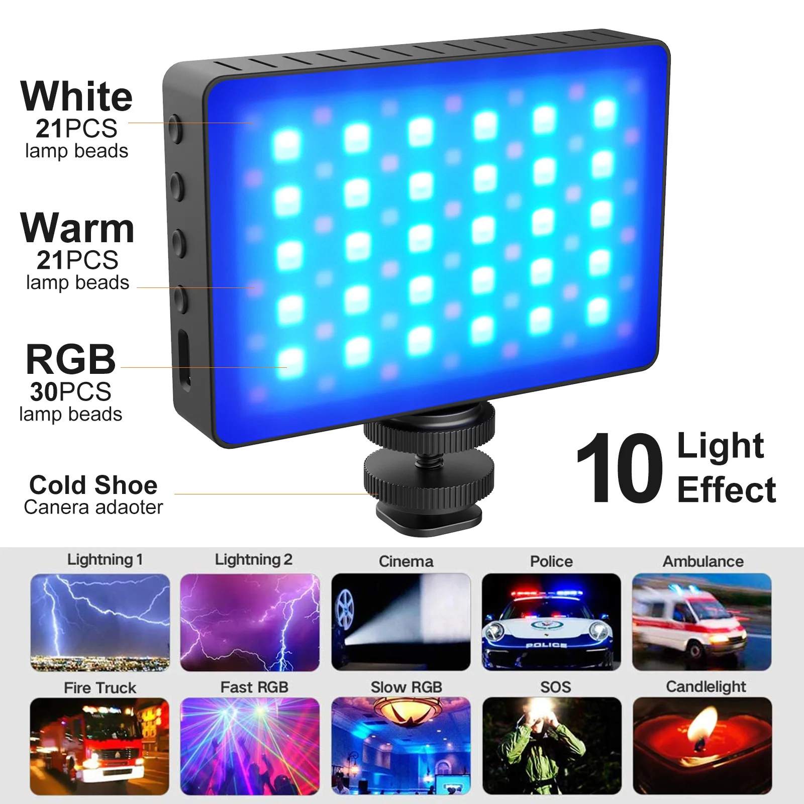 ? [RGB полноцветный, CRI95 +, 10 сценических симуляций] светодиодный светильник для камеры с 72 светодиодный s (21 теплый белый + 21 холодный белый + 30 RGB), CRI≥ 95. Полноцветный RGB (диапазон оттенка от 0 до 360) имеет 2 режима работы RGB, до 16 миллионов комбинированных цветов, поддерживает чувствительную регулировку оттенка, яркости и насыщенности, И поддерживает 10 режимов сцены для удовлетворения различных требований к съемке.