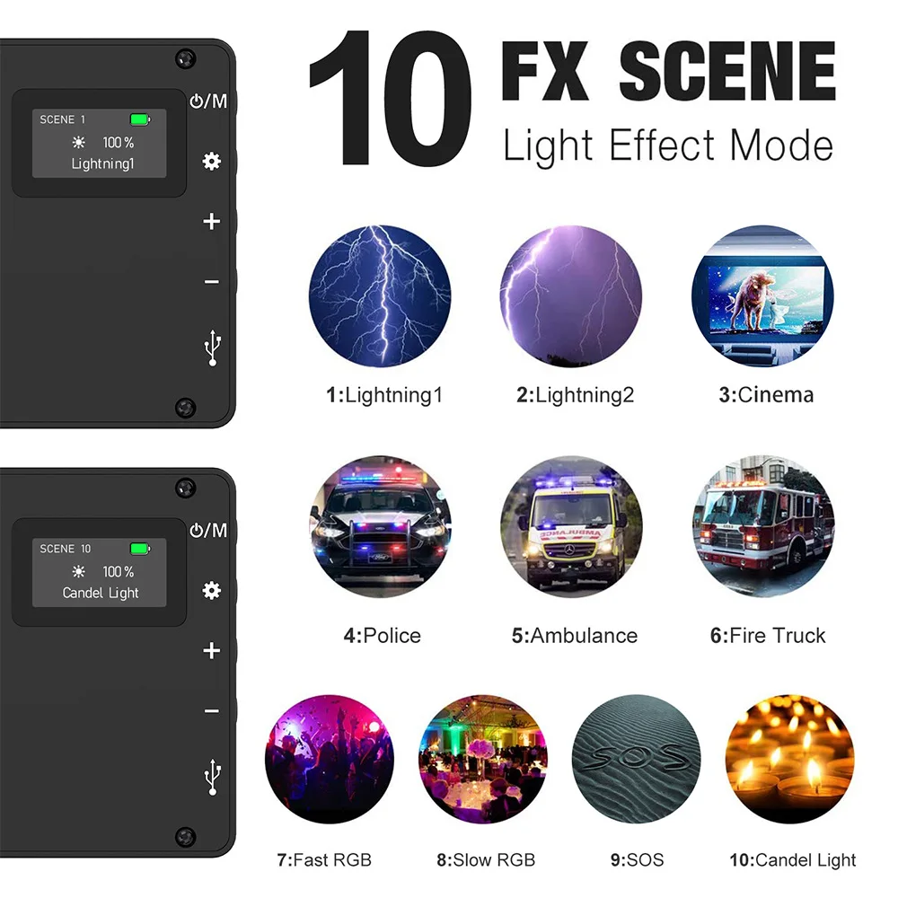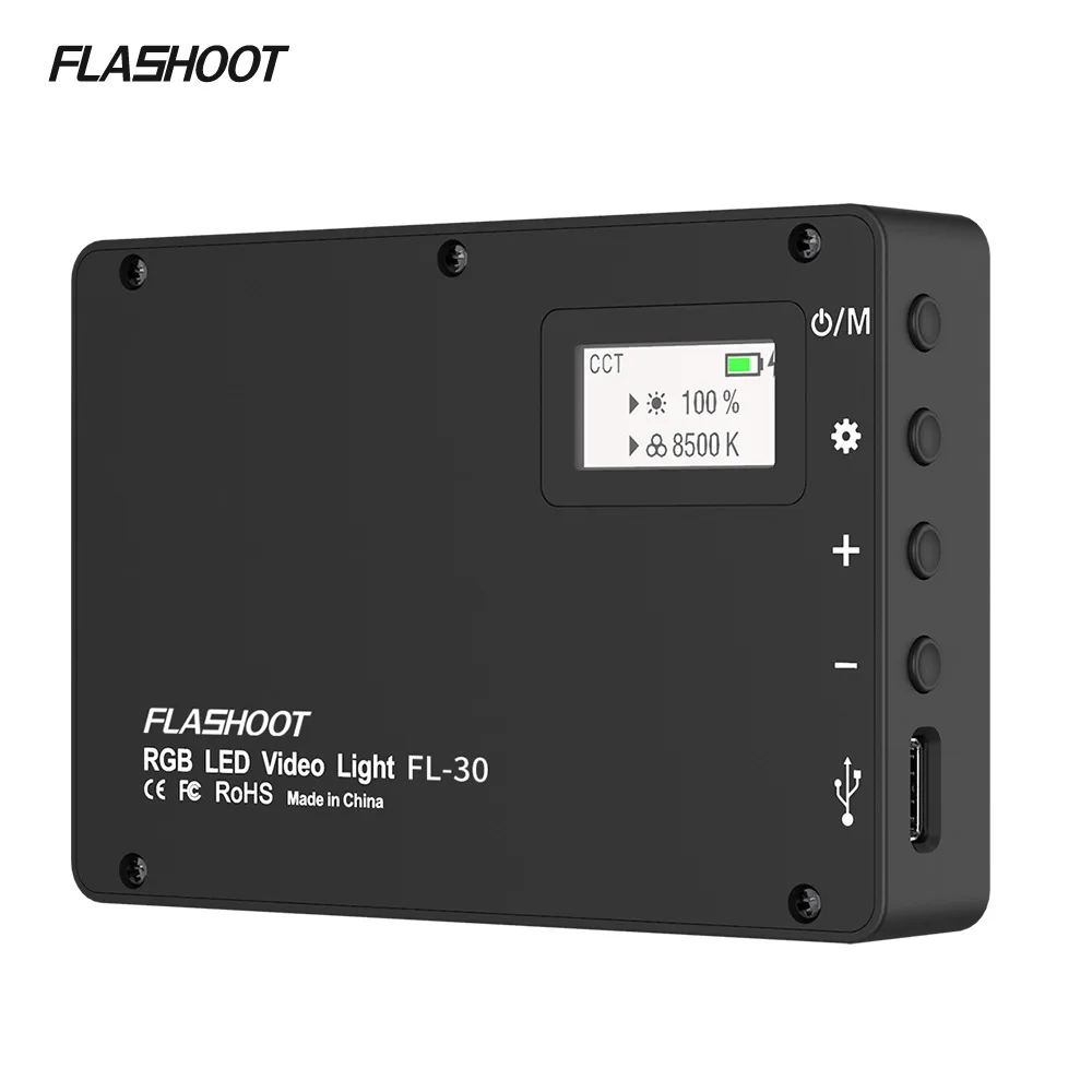 ? [Светодиодный светильник RGB] светильник для камеры FLASHOOT FL-30 очень прост в установке. Вы можете легко регулировать цветовую температуру от 2800K до 8500K и яркость от 0% до 100%. RGB видео светильник принимает RGB 0-255 полный цвет, 10 видов эффектов сцены (светильник ing 1, светильник ing 2, кинотеатр, полиция, скорая помощь, пожарная машина, Быстрый RGB, SOS и светильник свечи). Встроенный oled-экран делает каждую регулировку четкой и простой в эксплуатации, что позволяет работать более эффективно.