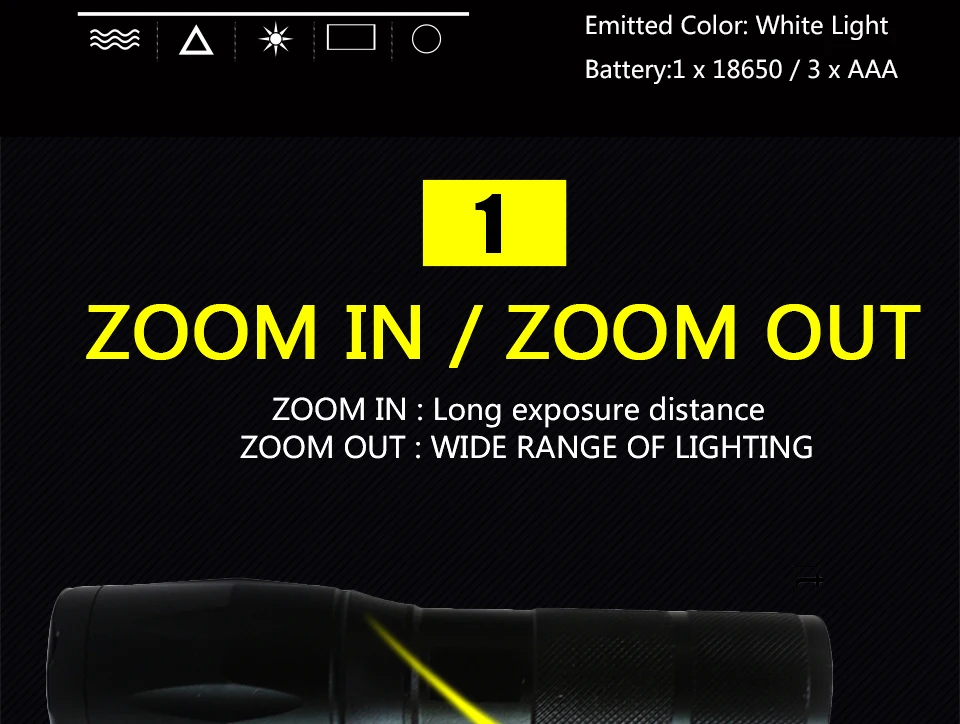 • Батарея: 1x18650 / 3 x AAA (не входит в комплект)