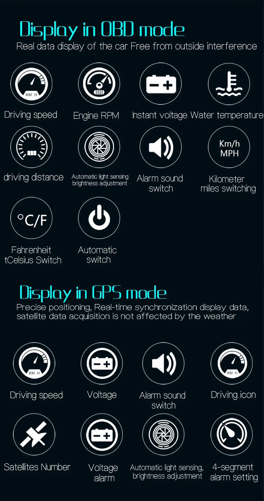 1. Отображение информации о режиме OBD:Скорость вождения (км/ч или миль/ч), двигатель об/мин, напряжение, температура воды (°C или °F), пробегБудильник:Сигнализация скорости, высокая температура воды, низкое напряжение2. Отображение информации о режиме GPS: Скорость движения, напряжение, спутниковые номераСигнализация: Оповещение о превышении скорости, оповещение о напряженииРучная или автоматическая регулировка яркости