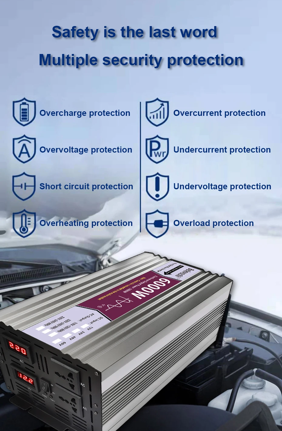 5: восьмибитная Интеллектуальная защита: защита от перегрузки, защита от высокого напряжения, защита от низкого напряжения, защита от перегрева, защита от обратного подключения, защита от короткого замыкания, защита от перегрузки по току, Страховая защита, интеллектуальное управление чипом, идеальная защита.
