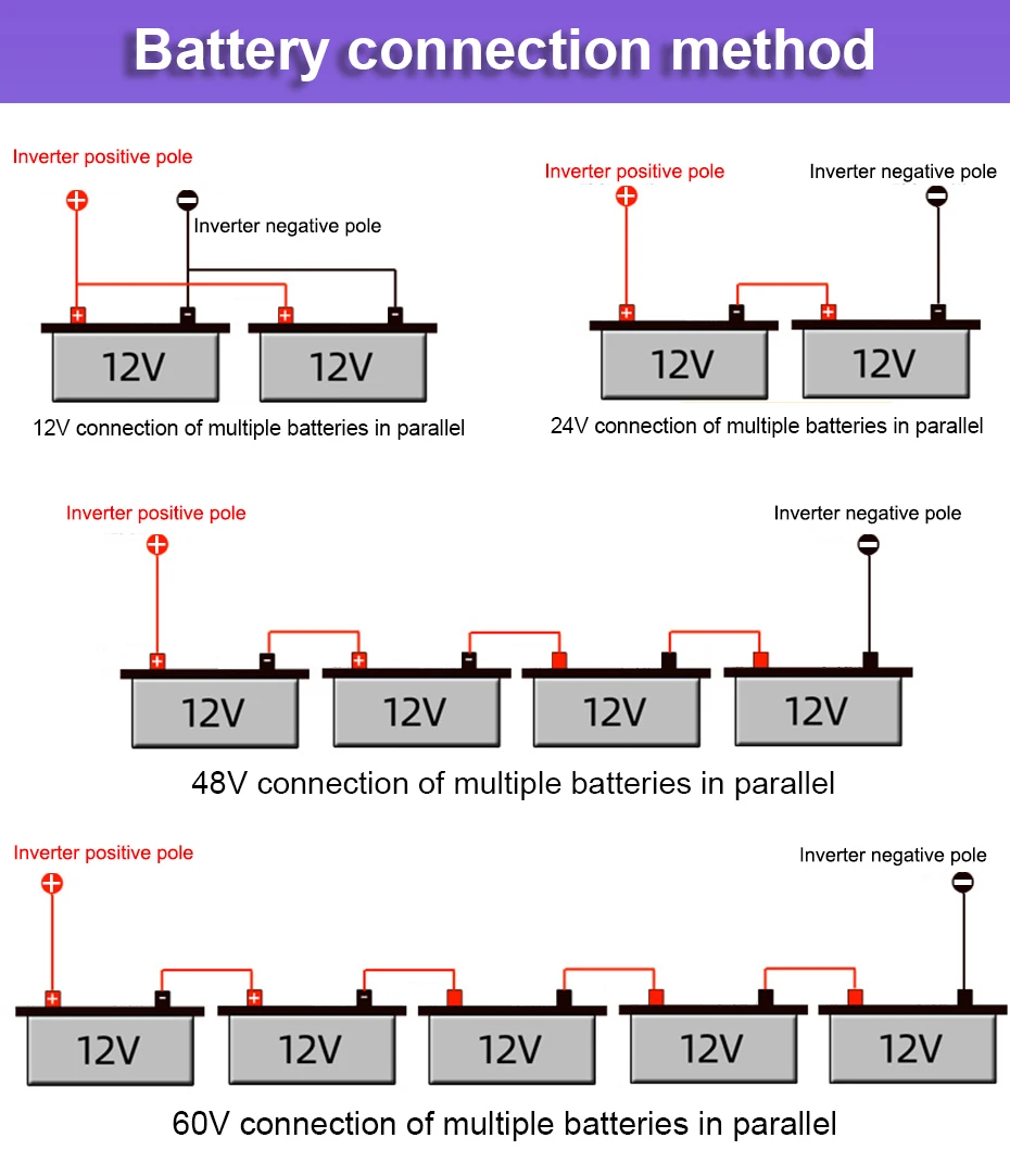 Напряжение аккумулятора должно соответствовать напряжению инвертора. Как правило, автомобильная батарея 12 В, батарея грузовика 24 В, электромобиль с четырьмя батареями 48 в, а электромобиль с пятью батареями 60 в. Например, автомобильный аккумулятор 12 В требует подключения инвертора 12 В.