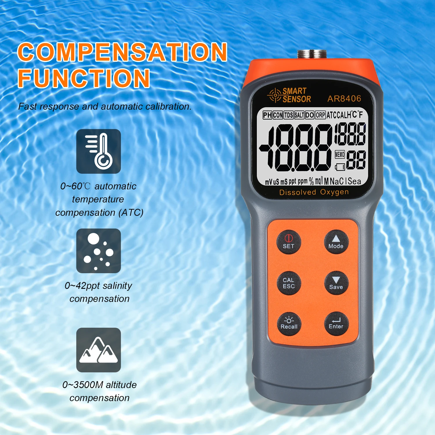 [Функция компенсации] 0 ~ 42ppt компенсация солености и 0 ~ 3500m компенсация высоты и 0 ~ 60 ℃ Автоматическая компенсация температуры (ATC), быстрая реакция и автоматическая калибровка.