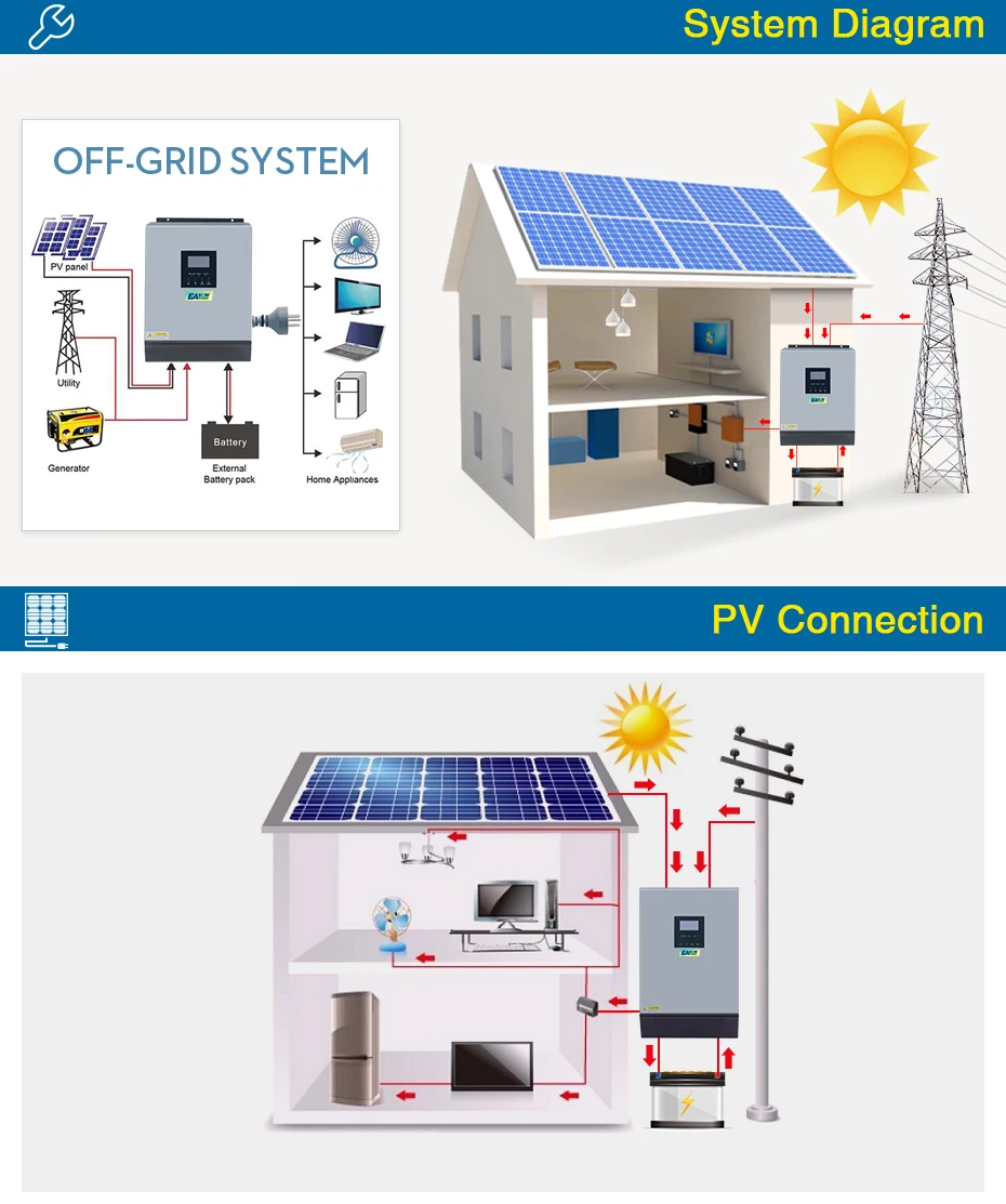 Это многофункциональный инвертор/зарядное устройство, сочетающее функции инвертора, PWM солнечное зарядное устройство и зарядное устройство для обеспечения бесперебойного питания с портативным размером. Его комплексный ЖК-дисплей обеспечивает удобную и легкодоступную работу кнопок, таких как ток зарядки аккумулятора. Приоритет переменного/солнечного зарядного устройства и Допустимое входное напряжение на основе различных приложений
