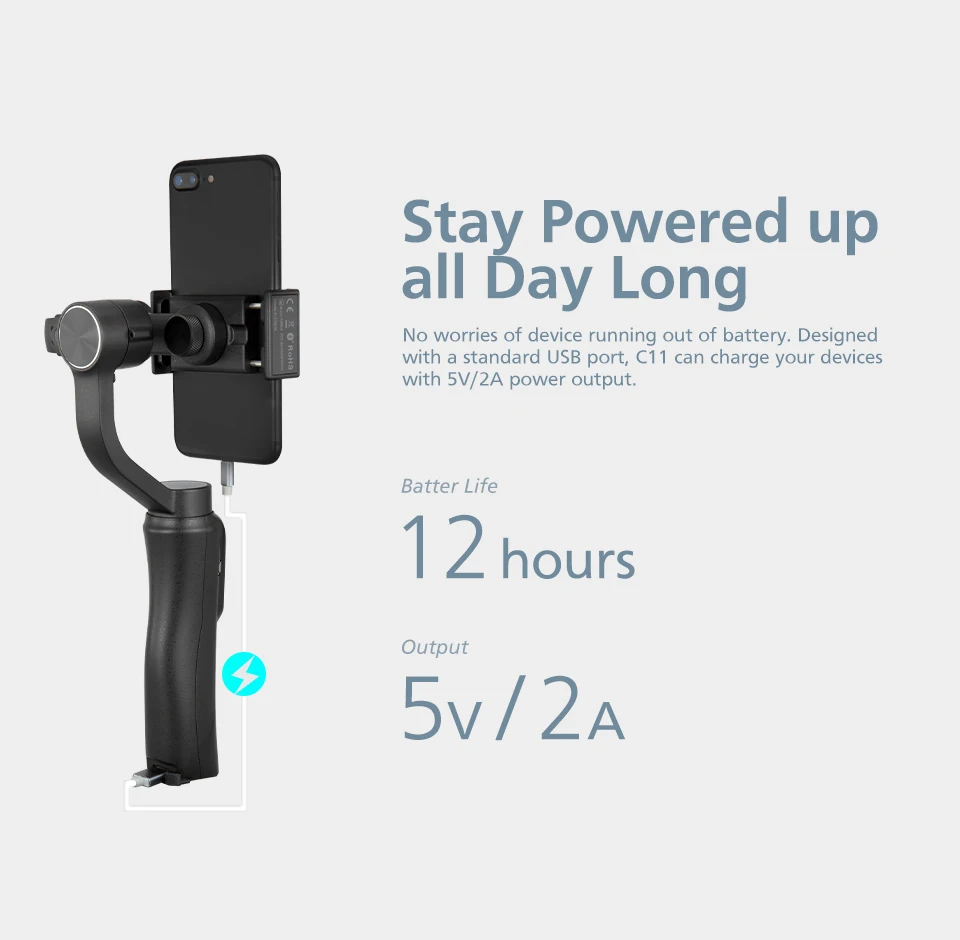 C11 поставляется с небольшим корпусом, но превосходной емкостью. Встроенный аккумулятор обеспечивает до 12 часов работы, а также позволяет заряжать телефон с помощью USB-порта под ручкой. Вы можете снимать снаружи, не беспокоясь о разряде питания. Стандартный USB-порт позволяет заряжать смартфон во время съемки с выходной мощностью 5 В/2 А.