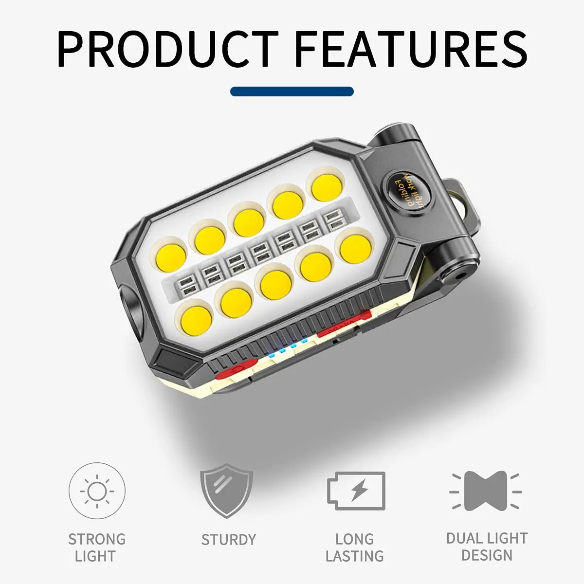 【Четыре режима и Перезаряжаемый 】: Этот перезаряжаемый рабочий светильник Встроенный перезаряжаемый аккумулятор емкостью 4400 мАч, оснащенный индикатором заряда батареи, вы всегда можете узнать оставшуюся мощность аккумулятора. Имеет 4 светильник ing режимы: спереди светильник/высокая Яркость/низкая Яркость/красные и синие мигающие, идеально подходит для отдыха на открытом воздухе, инструменты для ремонта автомобилей или безопасность лампы.