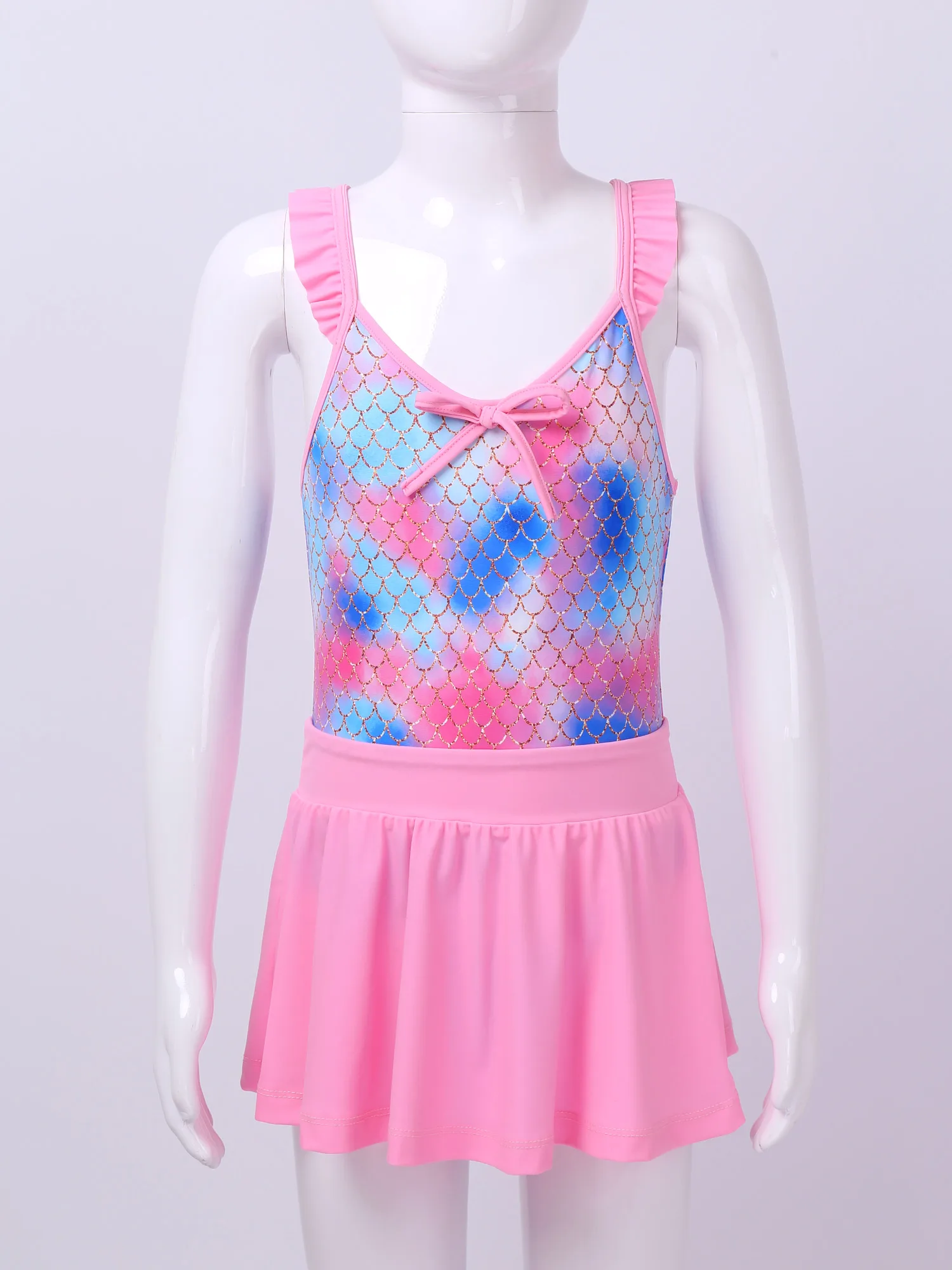 Детский комплект из 2 предметов для девочек: комбинезон с v-образным вырезом и открытой спиной с принтом рыбьей чешуи и юбка, купальный костюм.